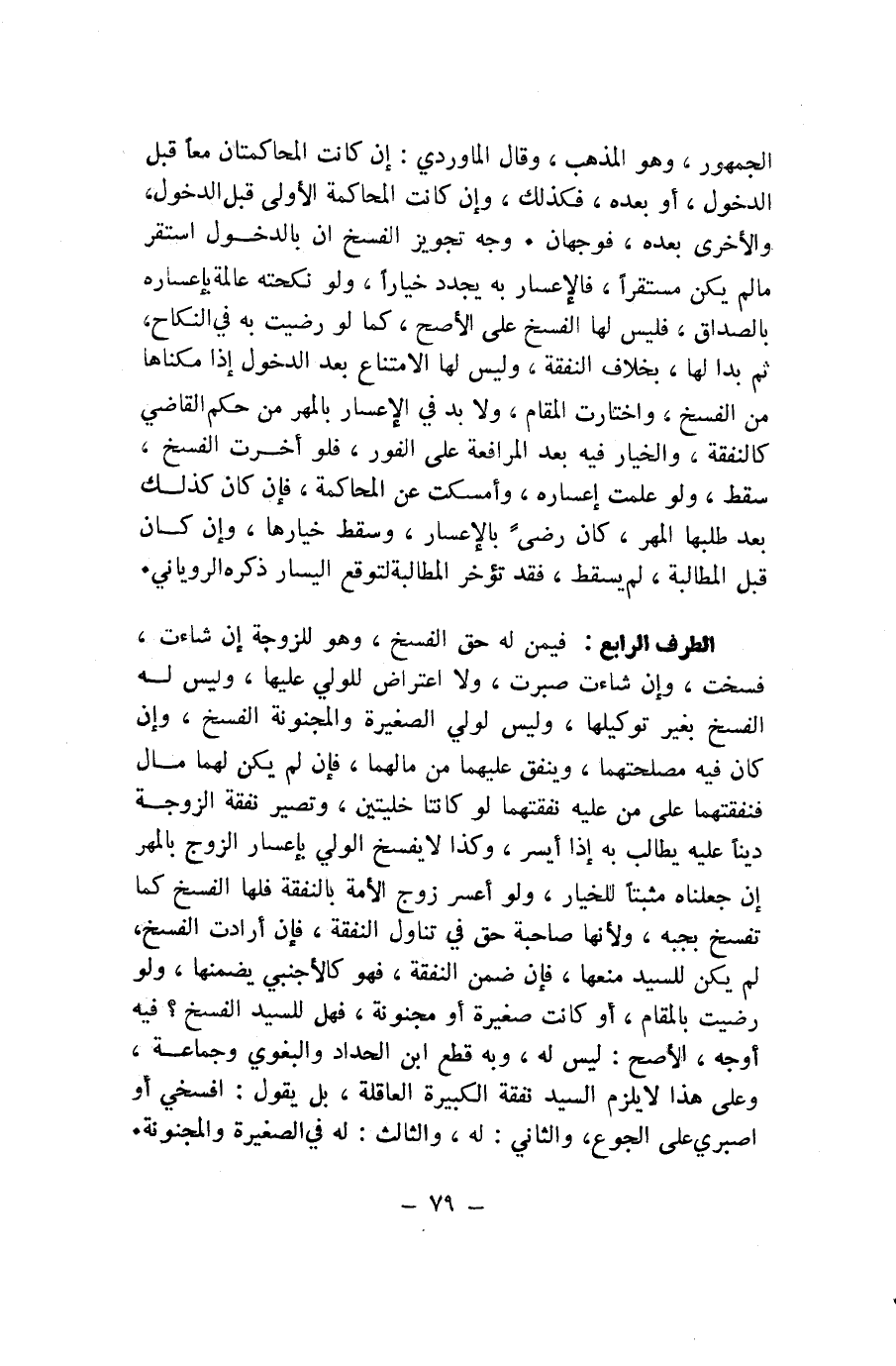 الطَّرَفُ الرَّابِعُ: فِيمَنْ لَهُ حَقُّ الْفَسْخِ، وَهُوَ لِلزَّوْجَةِ إِنْ شَاءَتْ، فَسَخَتْ، وَإِنْ شَاءَتْ صَبَرَتْ، وَلَا اعْتِرَاضَ لِلْوَلِيِّ عَلَيْهَا، وَلَيْسَ لَهُ الْفَسْخُ بِغَيْرِ تَوْكِيلِهَا، وَلَيْسَ لِوَلِيِّ الصَّغِيرَةِ وَالْمَجْنُونَةِ الْفَسْخُ، وَإِنْ كَانَ فِيهِ مَصْلَحَتُهُمَا، وَيُنْفِقُ عَلَيْهِمَا مِنْ مَالِهِمَا، فَإِنْ لَمْ يَكُنْ لَهُمَا مَالٌ فَنَفَقَتُهُمَا عَلَى مَنْ عَلَيْهِ نَفَقَتُهُمَا لَوْ كَانَتَا خَلِيَّتَيْنِ، وَتَصِيرُ نَفَقَةُ الزَّوْجَةِ دَيْنًا عَلَيْهِ يُطَالَبُ بِهِ إِذَا أَيْسَرَ، وَكَذَا لَا يَفْسَخُ الْوَلِيُّ بِإِعْسَارِ الزَّوْجِ بِالْمَهْرِ إِنْ جَعَلْنَاهُ مُثْبِتًا لِلْخِيَارِ، وَلَوْ أُعْسِرَ زَوْجُ الْأَمَةِ بِالنَّفَقَةِ فَلَهَا الْفَسْخُ كَمَا تَفْسَخُ بِجَبِّهِ، وَلِأَنَّهَا صَاحِبَةُ حَقٍّ فِي تَنَاوُلِ النَّفَقَةِ، فَإِنْ أَرَادَتِ الْفَسْخَ، لَمْ يَكُنْ لِلسَّيِّدِ مَنْعُهَا، فَإِنْ ضَمِنَ النَّفَقَةَ، فَهُوَ كَالْأَجْنَبِيِّ يَضْمَنُهَا، وَلَوْ رَضِيَتْ بِالْمَقَامِ، أَوْ كَانَتْ صَغِيرَةً أَوْ مَجْنُونَةً، فَهَلْ لِلسَّيِّدِ الْفَسْخُ؟ فِيهِ أَوْجُهٌ: الْأَصَحُّ: لَيْسَ لَهُ، وَبِهِ قَطَعَ ابْنُ الْحَدَّادِ وَالْبَغَوِيُّ وَجَمَاعَةٌ، وَعَلَى هَذَا لَا يَلْزَمُ السَّيِّدَ نَفَقَةُ الْكَبِيرَةِ الْعَاقِلَةِ، بَلْ يَقُولُ: افْسَخِي أَوِ اصْبِرِي عَلَى الْجُوعِ، وَالثَّانِي: لَهُ، وَالثَّالِثُ: لَهُ فِي الصَّغِيرَةِ وَالْمَجْنُونَةِ.