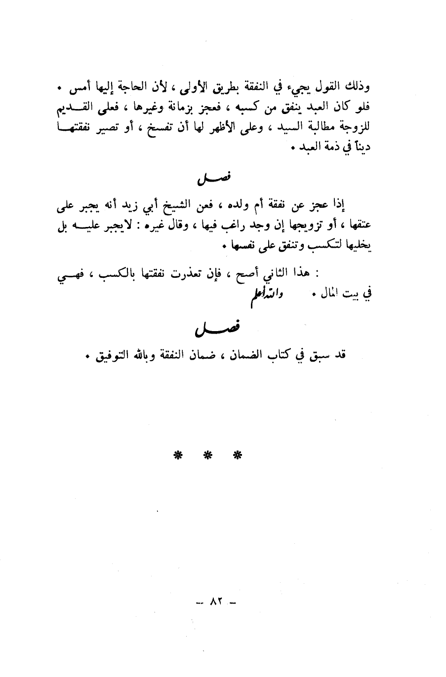 وَذَلِكَ الْقَوْلُ يَجِيءُ فِي النَّفَقَةِ بِطَرِيقِ الْأَوْلَى، لِأَنَّ الْحَاجَةَ إِلَيْهَا أَمَسَّ. فَلَوْ كَانَ الْعَبْدُ يُنْفِقُ مِنْ كَسْبِهِ، فَعَجَزَ بِزَمَانَةٍ وَغَيْرِهَا، فَعَلَى الْقَدِيمِ لِلزَّوْجَةِ مُطَالَبَةُ السَّيِّدِ، وَعَلَى الْأَظْهَرِ لَهَا أَنْ تَفْسَخَ، أَوْ تَصِيرَ نَفَقَتُهَا دَيْنًا فِي ذِمَّةِ الْعَبْدِ.