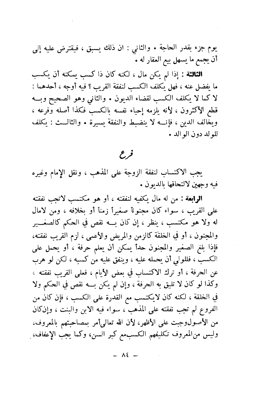 الرَّابِعَةُ: مَنْ لَهُ مَالٌ يَكْفِيهِ لِنَفَقَتِهِ، أَوْ هُوَ مُكْتَسِبٌ لَا تَجِبُ نَفَقَتُهُ عَلَى الْقَرِيبِ، سَوَاءٌ كَانَ مَجْنُونًا صَغِيرًا زَمَنًا أَوْ بِخِلَافِهِ، وَمَنْ لَا مَالَ لَهُ وَلَا هُوَ مُكْتَسِبٌ، يُنْظَرُ، إِنْ كَانَ بِهِ نَقْصٌ فِي الْحُكْمِ كَالصَّغِيرِ وَالْمَجْنُونِ، أَوْ فِي الْخِلْقَةِ كَالزَّمِنِ وَالْمَرِيضِ وَالْأَعْمَى، لَزِمَ الْقَرِيبَ نَفَقَتُهُ، فَإِذَا بَلَغَ الصَّغِيرُ وَالْمَجْنُونُ حَدًّا يُمْكِنُ أَنْ يُعَلَّمَ حِرْفَةً، أَوْ يُحْمَلَ عَلَى الْكَسْبِ، فَلِلْوَلِيِّ أَنْ يَحْمِلَهُ عَلَيْهِ، وَيُنْفِقَ عَلَيْهِ مِنْ كَسْبِهِ، لَكِنْ لَوْ هَرَبَ عَنِ الْحِرْفَةِ، أَوْ تَرَكَ الِاكْتِسَابَ فِي بَعْضِ الْأَيَّامِ، فَعَلَى الْقَرِيبِ نَفَقَتُهُ، وَكَذَا لَوْ كَانَ لَا تَلِيقُ بِهِ الْحِرْفَةُ، وَإِنْ لَمْ يَكُنْ بِهِ نَقْصٌ فِي الْحُكْمِ وَلَا فِي الْخِلْقَةِ، لَكِنَّهُ كَانَ لَا يَكْتَسِبُ مَعَ الْقُدْرَةِ عَلَى الْكَسْبِ، فَإِنْ كَانَ مِنَ الْفُرُوعِ لَمْ تَجِبْ نَفَقَتُهُ عَلَى الْمَذْهَبِ، سَوَاءٌ فِيهِ الِابْنُ وَالْبِنْتُ، وَإِنْ كَانَ مِنَ الْأُصُولِ وَجَبَتْ عَلَى الْأَظْهَرِ، لِأَنَّ اللَّهَ تَعَالَى أَمَرَ بِمُصَاحَبَتِهِمْ بِالْمَعْرُوفِ، وَلَيْسَ مِنَ الْمَعْرُوفِ تَكْلِيفُهُمُ الْكَسْبَ مَعَ كِبَرِ السِّنِّ، وَكَمَا يَجِبُ الْإِعْفَافُ،