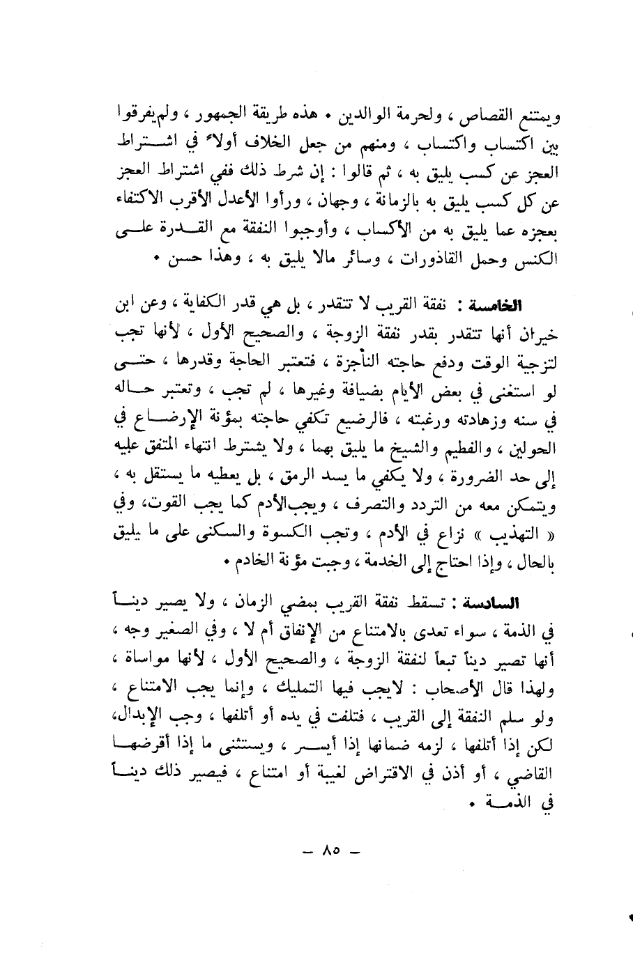 الْخَامِسَةُ: نَفَقَةُ الْقَرِيبِ لَا تَتَقَدَّرُ، بَلْ هِيَ قَدْرُ الْكِفَايَةِ، وَعَنِ ابْنِ خَيْرَانِ أَنَّهَا تَتَقَدَّرُ بِقَدْرِ نَفَقَةِ الزَّوْجَةِ، وَالصَّحِيحُ الْأَوَّلُ، لِأَنَّهَا تَجِبُ لِتَزْجِيَةِ الْوَقْتِ وَدَفْعِ حَاجَتِهِ النَّاجِزَةِ، فَتُعْتَبَرُ الْحَاجَةُ وَقَدْرُهَا، حَتَّى لَوِ اسْتَغْنَى فِي بَعْضِ الْأَيَّامِ بِضِيَافَةٍ وَغَيْرِهَا، لَمْ تَجِبْ، وَتُعْتَبَرْ حَالُهُ فِي سِنِّهِ وَزَهَادَتِهِ وَرَغْبَتِهِ، فَالرَّضِيعُ تَكْفِي حَاجَتَهُ بِمُؤْنَةِ الْإِرْضَاعِ فِي الْحَوْلَيْنِ، وَالْفَطِيمُ وَالشَّيْخُ مَا يَلِيقُ بِهِمَا، وَلَا يُشْتَرَطُ انْتِهَاءُ الْمُتَّفَقِ عَلَيْهِ إِلَى حَدِّ الضَّرُورَةِ، وَلَا يَكْفِي مَا يَسُدُّ الرَّمَقَ، بَلْ يُعْطِيهِ مَا يَسْتَقِلُّ بِهِ، وَيَتَمَكَّنُ مَعَهُ مِنَ التَّرَدُّدِ وَالتَّصَرُّفِ، وَيَجِبُ الْأُدْمُ كَمَا يَجِبُ الْقُوتُ، وَفِي «التَّهْذِيبِ» نِزَاعٌ فِي الْأُدْمِ، وَتَجِبُ الْكِسْوَةُ وَالسُّكْنَى عَلَى مَا يَلِيقُ بِالْحَالِ، وَإِذَا احْتَاجَ إِلَى الْخِدْمَةِ، وَجَبَتْ مُؤْنَةُ الْخَادِمِ.