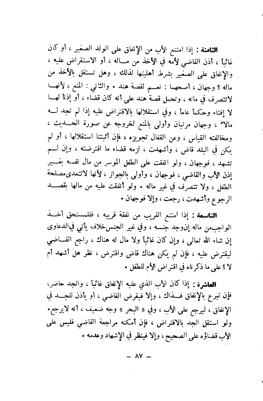 الثَّامِنَةُ: إِذَا امْتَنَعَ الْأَبُ مِنَ الْإِنْفَاقِ عَلَى الْوَلَدِ الصَّغِيرِ، أَوْ كَانَ غَائِبًا، أَذِنَ الْقَاضِي لِأُمِّهِ فِي الْأَخْذِ مِنْ مَالِهِ، أَوْ الِاسْتِقْرَاضِ عَلَيْهِ، وَالْإِنْفَاقِ عَلَى الصَّغِيرِ بِشَرْطِ أَهْلِيَّتِهَا لِذَلِكَ، وَهَلْ تَسْتَقِلُّ بِالْأَخْذِ مِنْ مَالِهِ؟ وَجْهَانِ: أَصَحُّهُمَا: نَعَمْ لِقِصَّةِ هِنْدٍ. وَالثَّانِي: الْمَنْعُ، لِأَنَّهَا لَا تَتَصَرَّفُ فِي مَالِهِ، وَتُحْمَلُ قِصَّةُ هِنْدٍ عَلَى أَنَّهُ كَانَ قَضَاءً، أَوْ إِذْنًا لَهَا لَا إِفْتَاءً وَحُكْمًا عَامًّا، وَفِي اسْتِقْلَالِهَا بِالِاقْتِرَاضِ عَلَيْهِ إِذَا لَمْ تَجِدْ لَهُ مَالًا، وَجْهَانِ مُرَتَّبَانِ وَأَوْلَى بِالْمَنْعِ لِخُرُوجِهِ عَنْ صُورَةِ الْحَدِيثِ، وَمُخَالَفَتِهِ الْقِيَاسَ، وَعَنِ الْقَفَّالِ تَجْوِيزُهُ، فَإِنْ أَثْبَتْنَا اسْتِقْلَالَهَا، أَوْ لَمْ يَكُنْ فِي الْبَلَدِ قَاضٍ، وَأَشْهَدَتْ، لَزِمَهُ قَضَاءُ مَا اقْتَرَضَتْهُ، وَإِنْ لَمْ تُشْهِدْ، فَوَجْهَانِ، وَلَوْ أَنْفَقَتْ عَلَى الطِّفْلِ الْمُوسِرِ مِنْ مَالِ نَفْسِهِ بِغَيْرِ إِذَنْ الْأَبِ وَالْقَاضِي، فَوَجْهَانِ، وَأَوْلَى بِالْجَوَازِ، لِأَنَّهَا لَا تَتَعَدَّى مَصْلَحَةَ الطِّفْلِ، وَلَا تَتَصَرَّفُ فِي غَيْرِ مَالِهِ. وَلَوْ أَنْفَقَتْ عَلَيْهِ مِنْ مَالِهَا بِقَصْدِ الرُّجُوعِ وَأَشْهَدَتْ، رَجَعَتْ، وَإِلَّا فَوَجْهَانِ.