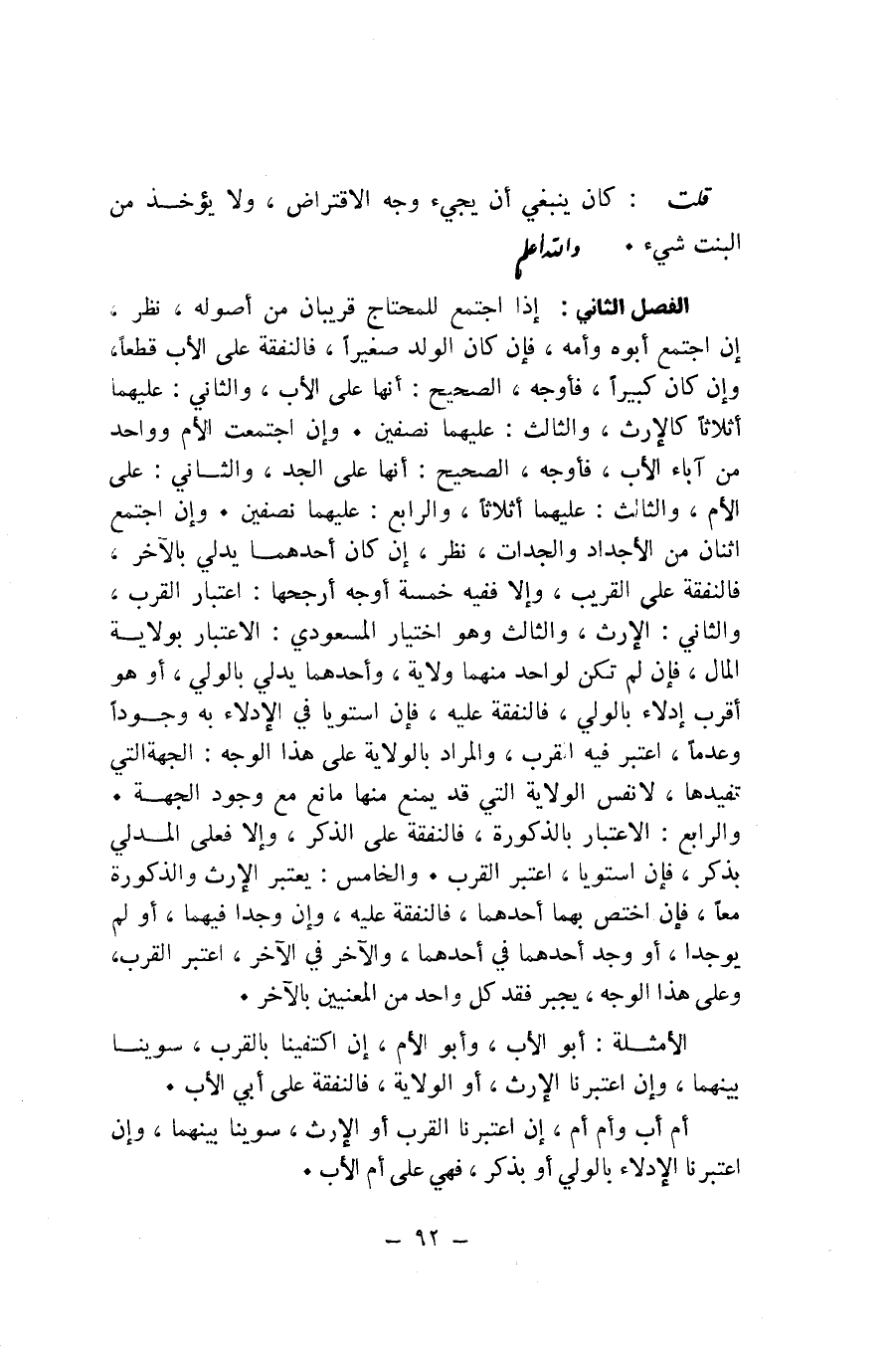 الْفَصْلُ الثَّانِي: إِذَا اجْتَمَعَ لِلْمُحْتَاجِ قَرِيبَانِ مِنْ أُصُولِهِ، نُظِرَ؛ إِنِ اجْتَمَعَ أَبُوهُ وَأُمُّهُ، فَإِنْ كَانَ الْوَلَدُ صَغِيرًا، فَالنَّفَقَةُ عَلَى الْأَبِ قَطْعًا، وَإِنْ كَانَ كَبِيرًا، فَأَوْجُهٌ: الصَّحِيحُ: أَنَّهَا عَلَى الْأَبِ، وَالثَّانِي: عَلَيْهِمَا أَثْلَاثًا كَالْإِرْثِ، وَالثَّالِثُ: عَلَيْهِمَا نِصْفَيْنِ. وَإِنِ اجْتَمَعَتِ الْأُمُّ وَوَاحِدٌ مِنْ آبَاءِ الْأَبِ، فَأَوْجُهٌ، الصَّحِيحُ: أَنَّهَا عَلَى الْجَدِّ، وَالثَّانِي: عَلَى الْأُمِّ، وَالثَّالِثُ: عَلَيْهِمَا أَثْلَاثًا، وَالرَّابِعُ: عَلَيْهِمَا نِصْفَيْنِ. وَإِنِ اجْتَمَعَ اثْنَانِ مِنَ الْأَجْدَادِ وَالْجَدَّاتِ، نُظِرَ؛ إِنْ كَانَ أَحَدُهُمَا يُدْلِي بِالْآخَرِ، فَالنَّفَقَةُ عَلَى الْقَرِيبِ، وَإِلَّا فَفِيهِ خَمْسَةُ أَوْجُهٍ أَرْجَحُهَا: اعْتِبَارُ الْقُرْبِ، وَالثَّانِي: الْإِرْثُ، وَالثَّالِثُ وَهُوَ اخْتِيَارُ الْمَسْعُودِيِّ: الِاعْتِبَارُ بِوِلَايَةِ الْمَالِ، فَإِنْ لَمْ تَكُنْ لِوَاحِدٍ مِنْهُمَا وِلَايَةٌ، وَأَحَدُهُمَا يُدْلِي بِالْوَلِيِّ، أَوْ هُوَ أَقْرَبُ إِدْلَاءً بِالْوَلِيِّ، فَالنَّفَقَةُ عَلَيْهِ، فَإِنِ اسْتَوَيَا فِي الْإِدْلَاءِ بِهِ وُجُودًا وَعَدَمًا، اعْتُبِرَ فِيهِ الْقُرْبُ، وَالْمُرَادُ بِالْوِلَايَةِ عَلَى هَذَا الْوَجْهِ: الْجِهَةُ الَّتِي تُفِيدُهَا، لَا نَفْسُ الْوِلَايَةِ الَّتِي قَدْ يَمْنَعُ مِنْهَا مَانِعٌ مَعَ وُجُودِ الْجِهَةِ. وَالرَّابِعُ: الِاعْتِبَارُ بِالذُّكُورَةِ، فَالنَّفَقَةُ عَلَى الذَّكَرِ، وَإِلَّا فَعَلَى الْمُدْلِي بِذَكَرٍ، فَإِنِ اسْتَوَيَا، اعْتُبِرَ الْقُرْبُ. وَالْخَامِسُ: يُعْتَبَرُ الْإِرْثُ وَالذُّكُورَةُ مَعًا، فَإِنِ اخْتَصَّ بِهِمَا أَحَدُهُمَا، فَالنَّفَقَةُ عَلَيْهِ، وَإِنْ وُجِدَا فِيهِمَا، أَوْ لَمْ يُوجَدَا، أَوْ وُجِدَ أَحَدُهُمَا فِي أَحَدِهِمَا، وَالْآخَرُ فِي الْآخَرِ، اعْتُبِرَ الْقُرْبُ، وَعَلَى هَذَا الْوَجْهِ يُجْبَرُ فَقْدُ كُلِّ وَاحِدٍ مِنَ الْمَعْنَيَيْنِ بِالْآخَرِ.