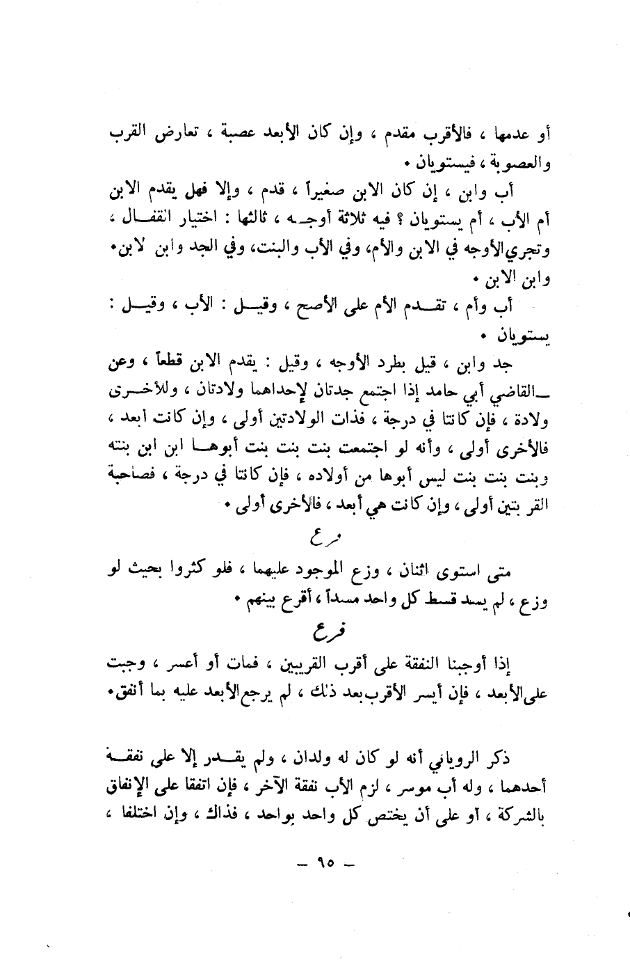 أَوْ عَدَمِهَا، فَالْأَقْرَبُ مُقَدَّمٌ، وَإِنْ كَانَ الْأَبْعَدُ عَصَبَةً، تَعَارَضَ الْقُرْبُ وَالْعُصُوبَةُ، فَيَسْتَوِيَانِ.