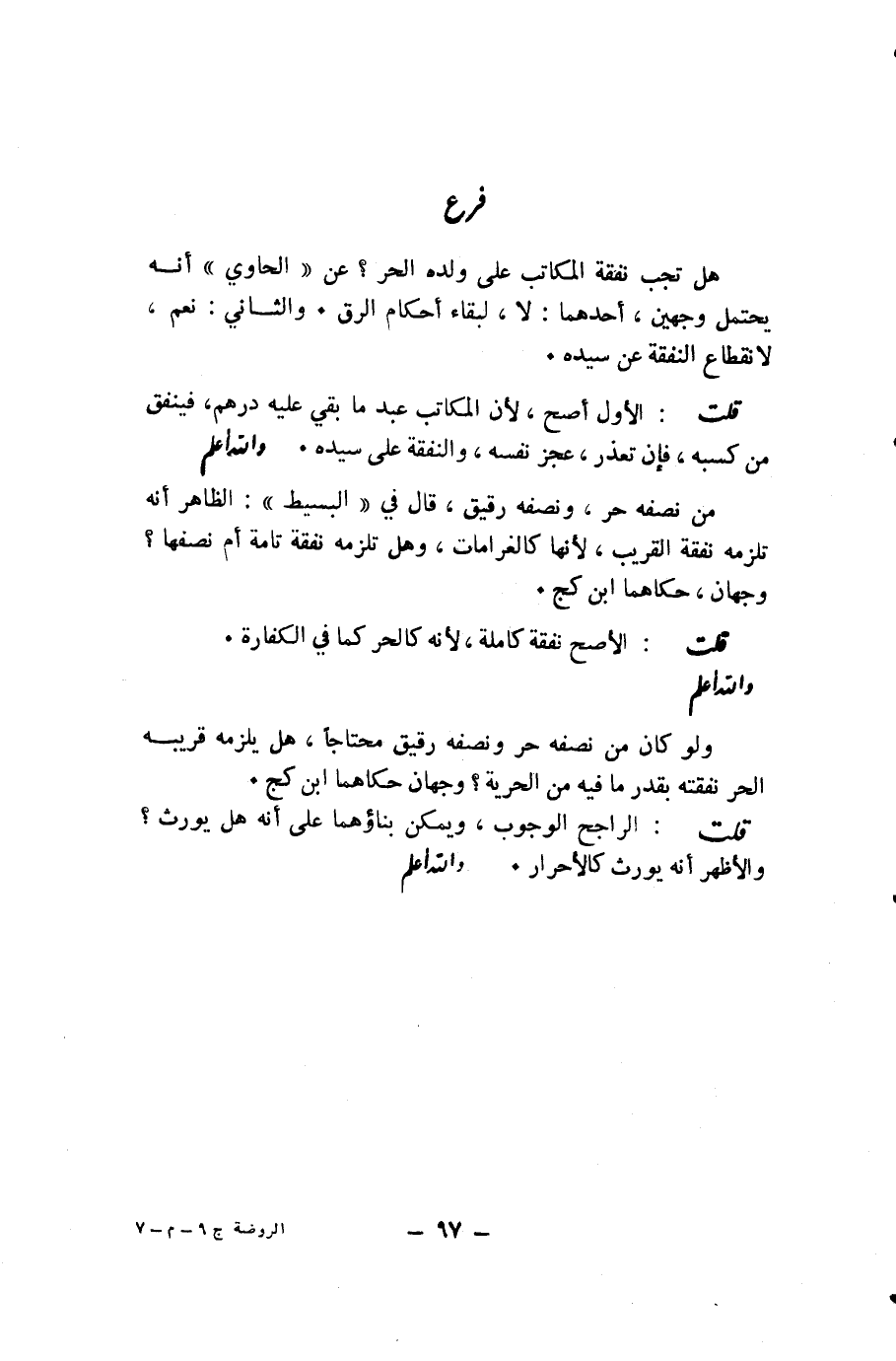 قُلْتُ: الرَّاجِحُ الْوُجُوبُ، وَيُمْكِنُ بِنَاؤُهُمَا عَلَى أَنَّهُ هَلْ يُوَرَّثُ؟ وَالْأَظْهَرُ أَنَّهُ يُوَرَّثُ كَالْأَحْرَارِ. وَاللَّهُ أَعْلَمُ.