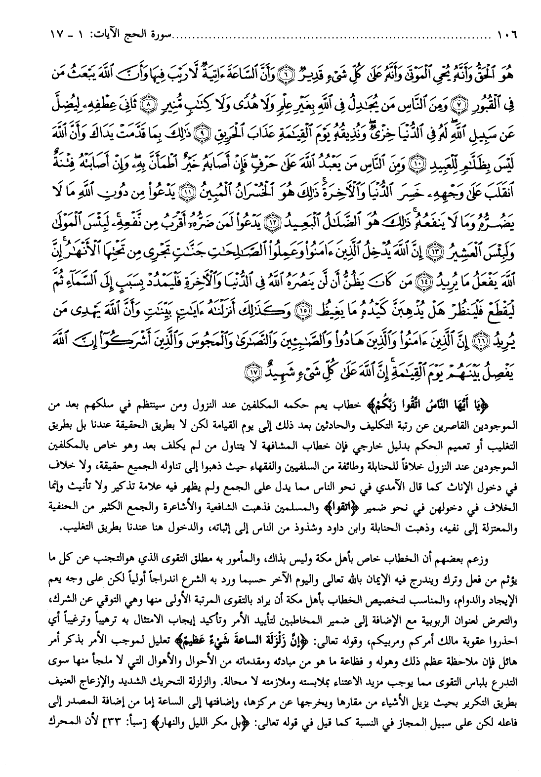 يا أَيُّهَا النَّاسُ اتَّقُوا رَبَّكُمْ خطاب يعم حكمه المكلفين عند النزول ومن سينتظم في سلكهم بعد من الموجودين القاصرين عن رتبة التكليف والحادثين بعد ذلك إلى يوم القيامة لكن لا بطريق الحقيقة عندنا بل بطريق التغليب أو تعميم الحكم بدليل خارجي فإن خطاب المشافهة لا يتناول من لم يكلف بعد وهو خاص بالمكلفين الموجودين عند النزول خلافا للحنابلة وطائفة من السلفيين والفقهاء حيث ذهبوا إلى تناوله الجميع حقيقة، ولا خلاف في دخول الإناث كما قال الآمدي في نحو الناس مما يدل على الجمع ولم يظهر فيه علامة تذكير ولا تأنيث وإنما الخلاف في دخولهن في نحو ضمير اتَّقُوا والمسلمين فذهبت الشافعية والأشاعرة والجمع الكثير من الحنفية والمعتزلة إلى نفيه، وذهبت الحنابلة وابن داود وشذوذ من الناس إلى إثباته، والدخول هنا عندنا بطريق التغليب.