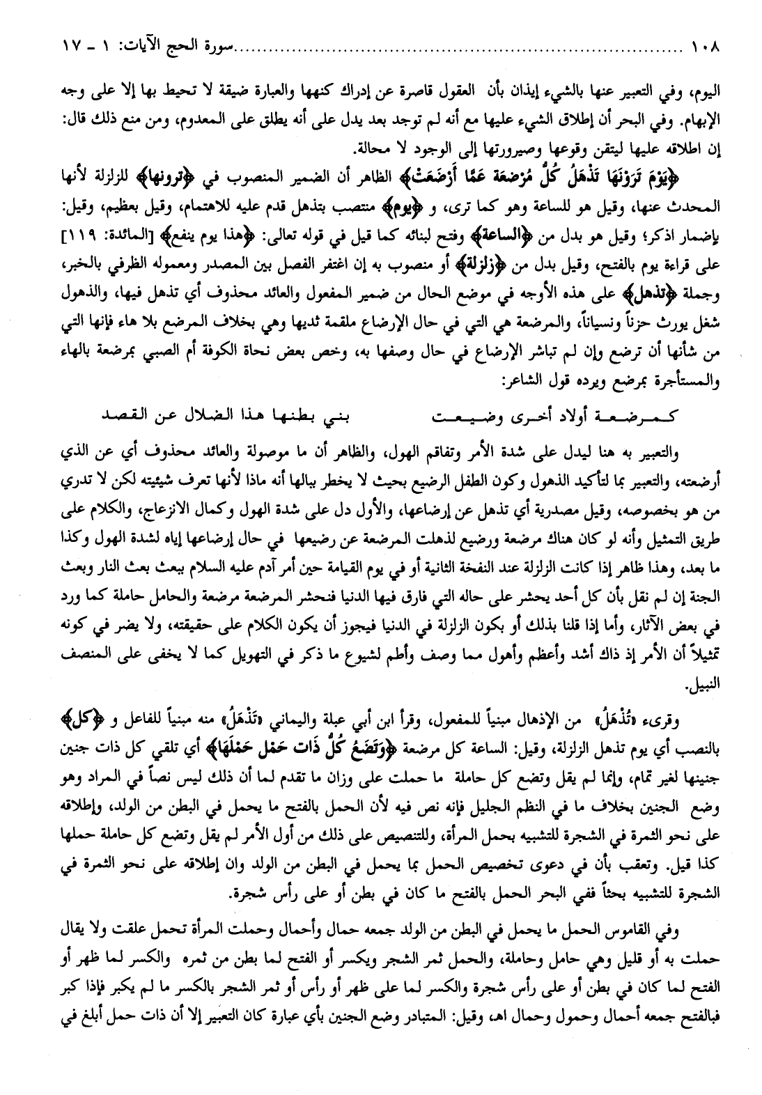 على هذه الأوجه في موضع الحال من ضمير المفعول والعائد محذوف أي تذهل فيها، والذهول شغل يورث حزنا ونسيانا، والمرضعة هي التي في حال الإرضاع ملقمة ثديها وهي بخلاف المرضع بلا هاء فإنها التي من شأنها أن ترضع وإن لم تباشر الإرضاع في حال وصفها به، وخص بعض نحاة الكوفة أم الصبي بمرضعة بالهاء والمستأجرة بمرضع ويرده قول الشاعر: