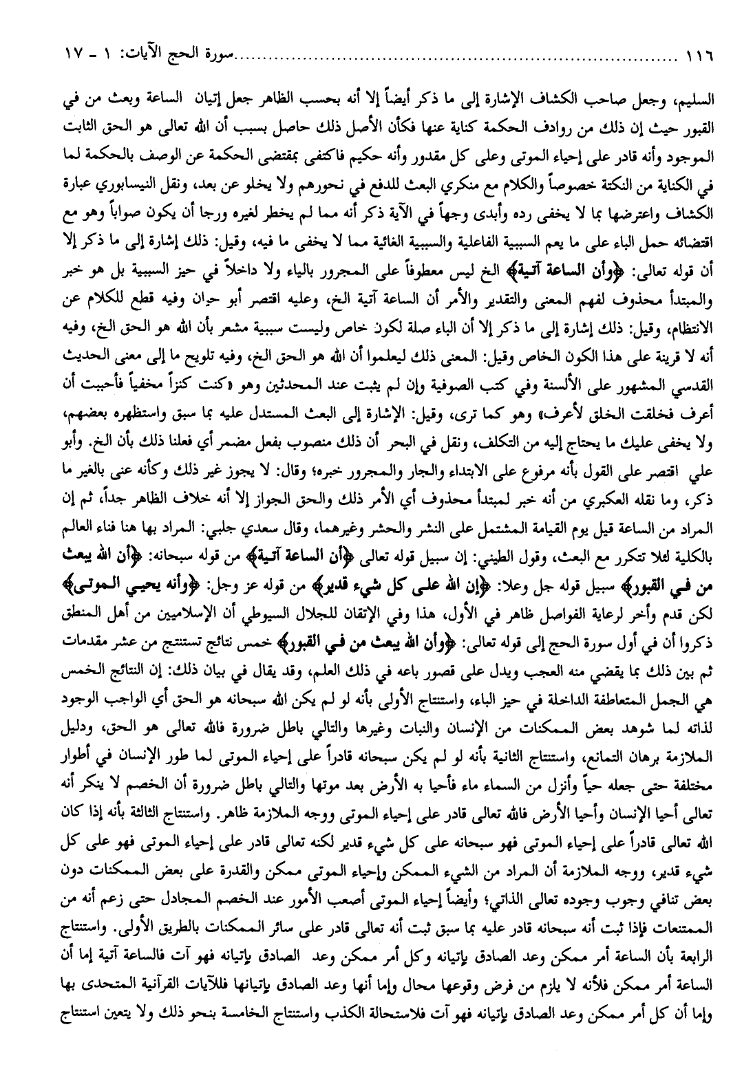 وهو كما ترى، وقيل: الإشارة إلى البعث المستدل عليه بما سبق واستظهره بعضهم، ولا يخفى عليك ما يحتاج إليه من التكلف، ونقل في البحر أن ذلك منصوب بفعل مضمر أي فعلنا ذلك بأن إلخ. وأبو علي اقتصر على القول بأنه مرفوع على الابتداء والجار والمجرور خبره وقال: لا يجوز غير ذلك وكأنه عنى بالغير ما ذكر، وما نقله العكبري من أنه خبر لمبتدأ محذوف أي الأمر ذلك والحق الجواز إلا أنه خلاف الظاهر جدا، ثم إن المراد من الساعة قيل يوم القيامة المشتمل على النشر والحشر وغيرهما، وقال سعدي جلبي: المراد بها هنا فناء العالم بالكلية لئلا تتكرر مع البعث، وقول الطيني: إن سبيل قوله تعالى أَنَّ السَّاعَةَ آتِيَةٌ من قوله سبحانه: أَنَّ اللَّهَ يَبْعَثُ مَنْ فِي الْقُبُورِ سبيل قوله جل وعلا: إن الله عَلى كُلِّ شَيْءٍ قَدِيرٌ من قوله عز وجل: وَأَنَّهُ يُحْيِ الْمَوْتى لكن قدم وأخر لرعاية الفواصل ظاهر في الأول، هذا وفي الإتقان للجلال السيوطي أن الإسلاميين من أهل المنطق ذكروا أن في أول سورة الحج إلى قوله تعالى: وَأَنَّ اللَّهَ يَبْعَثُ مَنْ فِي الْقُبُورِ خمس نتائج تستنتج من عشر مقدمات ثم بين ذلك بما يقضي منه العجب ويدل على قصور باعه في ذلك العلم، وقد يقال في بيان ذلك: إن النتائج الخمس هي الجمل المتعاطفة الداخلة في حيز الباء، واستنتاج الأولى بأنه لو لم يكن الله سبحانه هو الحق أي الواجب الوجود لذاته لما شوهد بعض الممكنات من الإنسان والنبات وغيرها والتالي باطل ضرورة فالله تعالى هو الحق، ودليل الملازمة برهان التمانع، واستنتاج الثانية بأنه لو لم يكن سبحانه قادرا على إحياء الموتى لما طور الإنسان في أطوار مختلفة حتى جعله حيا وأنزل من السماء ماء فأحيا به الأرض بعد موتها والتالي باطل ضرورة أن الخصم لا ينكر أنه تعالى أحيا الإنسان وأحيا الأرض فالله تعالى قادر على إحياء الموتى ووجه الملازمة ظاهر. واستنتاج الثالثة بأنه إذا كان الله تعالى قادرا على إحياء الموتى فهو سبحانه على كل شيء قدير لكنه تعالى قادر على إحياء الموتى فهو على كل شيء قدير، ووجه الملازمة أن المراد من الشيء الممكن وإحياء الموتى ممكن والقدرة على بعض الممكنات دون بعض تنافي وجوب وجوده تعالى الذاتي وأيضا إحياء الموتى أصعب الأمور عند الخصم المجادل حتى زعم أنه من الممتنعات فإذا ثبت أنه سبحانه قادر عليه بما سبق ثبت أنه تعالى قادر على سائر الممكنات بالطريق الأولى. واستنتاج الرابعة بأن الساعة أمر ممكن وعد الصادق بإتيانه وكل أمر ممكن وعد الصادق بإتيانه فهو آت فالساعة آتية إما أن الساعة أمر ممكن فلأنه لا يلزم من فرض وقوعها محال وإما أنها وعد الصادق بإتيانها فللآيات القرآنية المتحدى بها وإما أن كل أمر ممكن وعد الصادق بإتيانه فهو آت فلاستحالة الكذب واستنتاج الخامسة بنحو ذلك ولا يتعين استنتاج