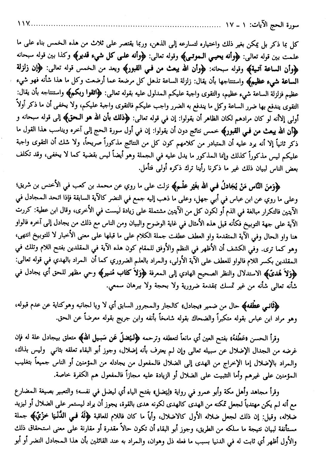 وَمِنَ النَّاسِ مَنْ يُجادِلُ فِي اللَّهِ بِغَيْرِ عِلْمٍ نزلت على ما روي عن محمد بن كعب في الأخنس بن شريق وعلى ما روي عن ابن عباس في أبي جهل، وعلى ما ذهب إليه جمع في النضر كالآية السابقة فإذا اتحد المجادل في الآيتين فالتكرار مبالغة في الذم أو لكون كل من الآيتين مشتملة على زيادة ليست في الأخرى، وقال ابن عطية: كررت الآية على جهة التوبيخ فكأنه قيل هذه الأمثال في غاية الوضوح والبيان ومن الناس مع ذلك من يجادل إلى آخره فالواو هنا واو الحال وفي الآية المتقدمة واو العطف عطفت جملة الكلام على ما قبلها على معنى الأخبار لا للتوبيخ انتهى، وهو كما ترى. وفي الكشف أن الأظهر في النظم والأوفق للمقام كون هذه الآية في المقلدين بفتح اللام وتلك في المقلدين بكسر اللام فالواو للعطف على الآية الأولى، والمراد بالعلم الضروري كما أن المراد بالهدي في قوله تعالى: