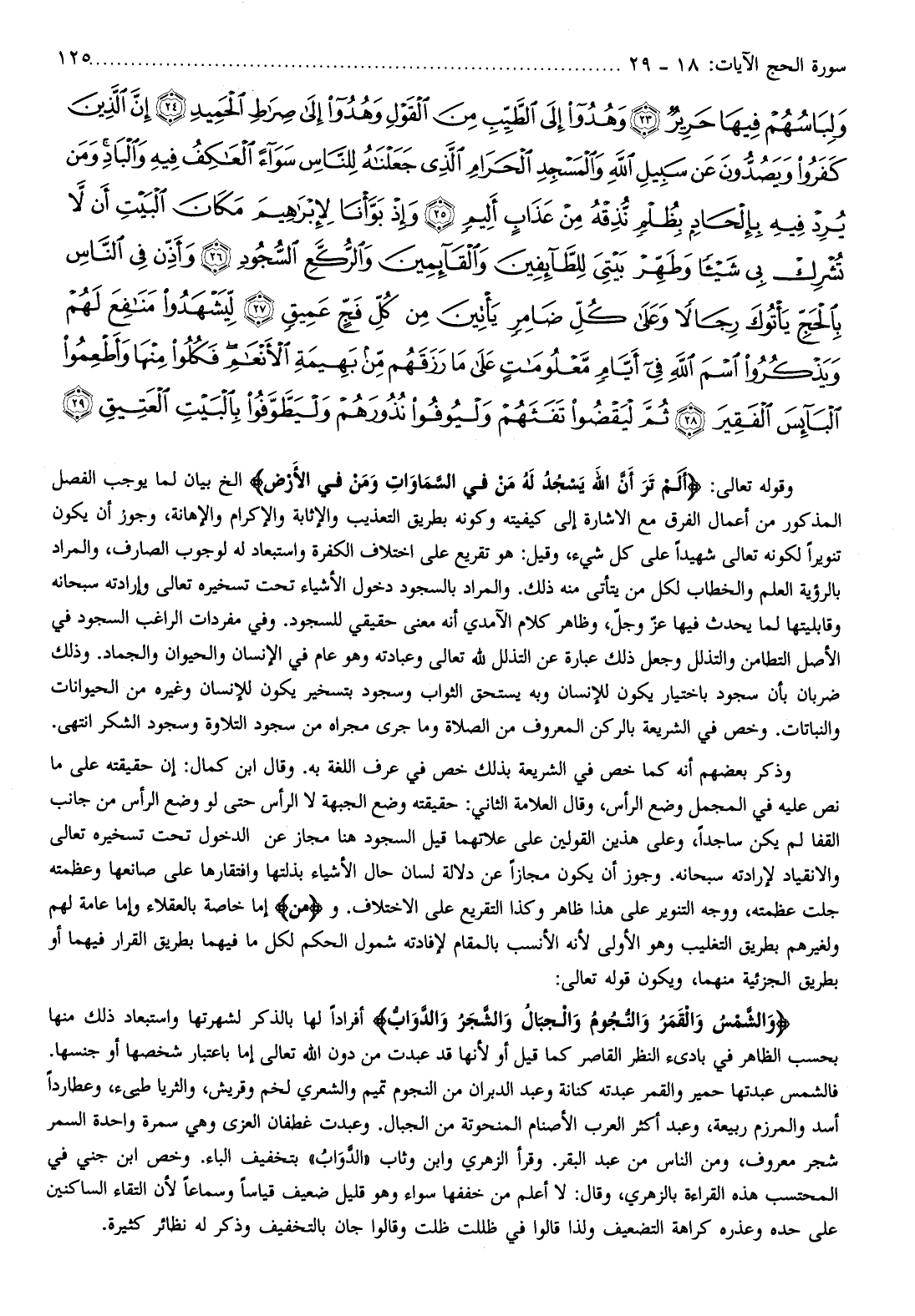 وقوله تعالى: أَلَمْ تَرَ أَنَّ اللَّهَ يَسْجُدُ لَهُ مَنْ فِي السَّماواتِ وَمَنْ فِي الْأَرْضِ إلخ بيان لما يوجب الفصل المذكور من أعمال الفرق مع الاشارة إلى كيفيته وكونه بطريق التعذيب والإثابة والإكرام والإهانة، وجوز أن يكون تنويرا لكونه تعالى شهيدا على كل شيء، وقيل: هو تقريع على اختلاف الكفرة واستبعاد له لوجوب الصارف، والمراد بالرؤية العلم والخطاب لكل من يتأتى منه ذلك. والمراد بالسجود دخول الأشياء تحت تسخيره تعالى وإرادته سبحانه وقابليتها لما يحدث فيها عزّ وجلّ، وظاهر كلام الآمدي أنه معنى حقيقي للسجود. وفي مفردات الراغب السجود في الأصل التطامن والتذلل وجعل ذلك عبارة عن التذلل لله تعالى وعبادته وهو عام في الإنسان والحيوان والجماد. وذلك ضربان بأن سجود باختيار يكون للإنسان وبه يستحق الثواب وسجود بتسخير يكون للإنسان وغيره من الحيوانات والنباتات. وخص في الشريعة بالركن المعروف من الصلاة وما جرى مجراه من سجود التلاوة وسجود الشكر انتهى.