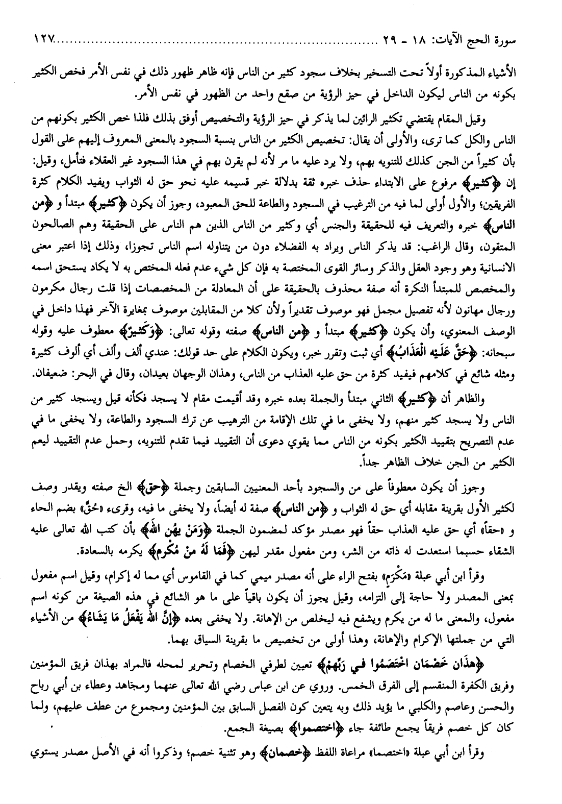 وقيل المقام يقتضي تكثير الرائين لما يذكر في حيز الرؤية والتخصيص أوفق بذلك فلذا خص الكثير بكونهم من الناس والكل كما ترى، والأولى أن يقال: تخصيص الكثير من الناس بنسبة السجود بالمعنى المعروف إليهم على القول بأن كثيرا من الجن كذلك للتنويه بهم، ولا يرد عليه ما مر لأنه لم يقرن بهم في هذا السجود غير العقلاء فتأمل، وقيل: