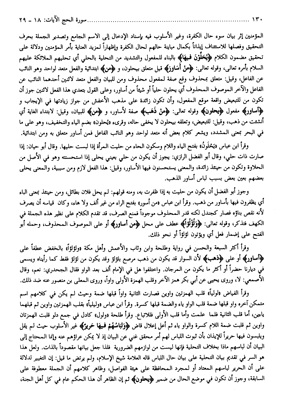 المؤمنين إثر بيان سوء حال الكفرة، وغير الأسلوب فيه بإسناد الإدخال إلى الاسم الجامع وتصدير الجملة بحرف التحقيق وفصلها للاستئناف إيذانا بكمال مباينة حالهم لحال الكفرة وإظهارا لمزيد العناية بأمر المؤمنين ودلالة على تحقيق مضمون الكلام يُحَلَّوْنَ فِيها بالبناء للمفعول والتشديد من التحلية بالحلي أي تحليهم الملائكة عليهم السلام بأمره تعالى، وقوله تعالى: مِنْ أَساوِرَ قيل متعلق بيحلون، ومِنْ ابتدائية والفعل متعد لواحد وهو النائب عن الفاعل، وقيل: متعلق بمحذوف وقع صفة لمفعول محذوف ومن للبيان والفعل متعد لاثنين أحدهما النائب عن الفاعل والآخر الموصوف المحذوف أي يحلون حليا أو شيئا من أساور، وعلى القول بتعدي هذا الفعل لاثنين جوز أن تكون من للتبعيض واقعة موقع المفعول، وأن تكون زائدة على مذهب الأخفش من جواز زيادتها في الإيجاب وأَساوِرَ مفعول يُحَلَّوْنَ وقوله تعالى: مِنْ ذَهَبٍ صفة لأساور، ومِنْ للبيان، وقيل: لابتداء الغاية أي أنشئت من ذهب، وقيل: للتبعيض، وتعلقه بيحلون لا يخفى حاله، وقرىء «يحلون» بضم الياء والتخفيف، وهو على ما في البحر بمعنى المشدد، ويشعر كلام بعض أنه متعد لواحد وهو النائب الفاعل فمن أساور متعلق به ومن ابتدائية.