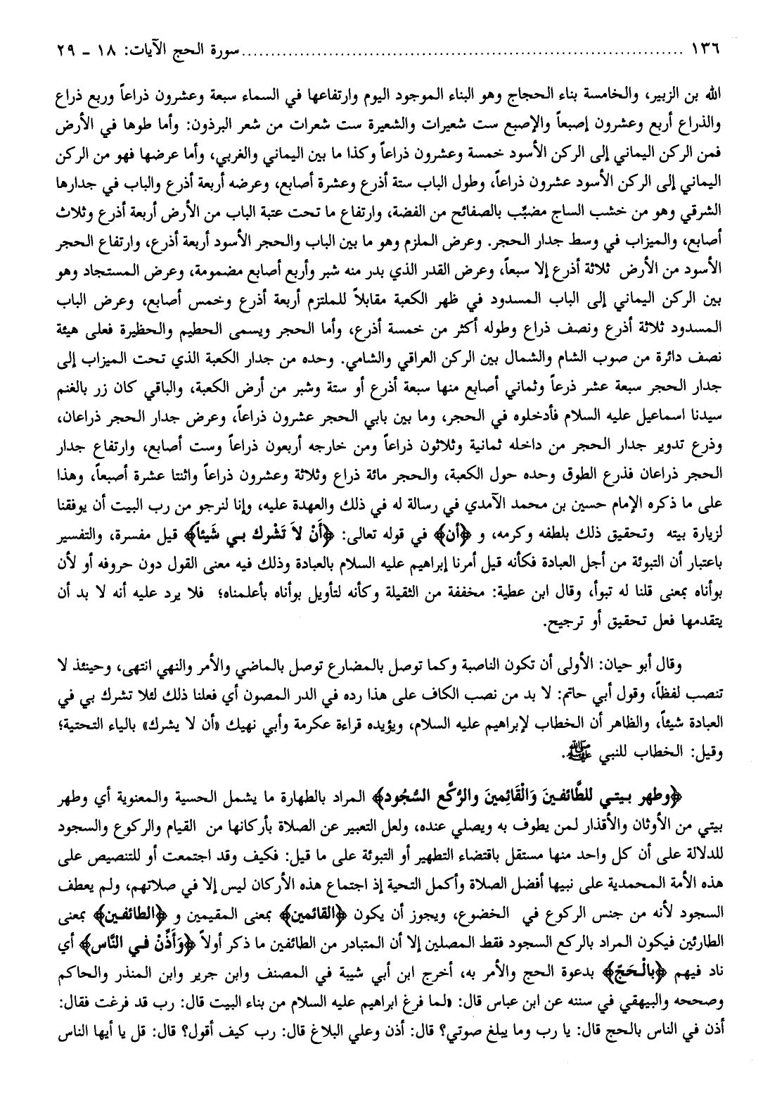 الله بن الزبير، والخامسة بناء الحجاج وهو البناء الموجود اليوم وارتفاعها في السماء سبعة وعشرون ذراعا وربع ذراع والذراع أربع وعشرون إصبعا والإصبع ست شعيرات والشعيرة ست شعرات من شعر البرذون: وأما طوها في الأرض فمن الركن اليماني إلى الركن الأسود خمسة وعشرون ذراعا وكذا ما بين اليماني والغربي، وأما عرضها فهو من الركن اليماني إلى الركن الأسود عشرون ذراعا، وطول الباب ستة أذرع وعشرة أصابع، وعرضه أربعة أذرع والباب في جدارها الشرقي وهو من خشب الساج مضبّب بالصفائح من الفضة، وارتفاع ما تحت عتبة الباب من الأرض أربعة أذرع وثلاث أصابع، والميزاب في وسط جدار الحجر. وعرض الملزم وهو ما بين الباب والحجر الأسود أربعة أذرع، وارتفاع الحجر الأسود من الأرض ثلاثة أذرع إلا سبعا، وعرض القدر الذي بدر منه شبر وأربع أصابع مضمومة، وعرض المستجاد وهو بين الركن اليماني إلى الباب المسدود في ظهر الكعبة مقابلا للملتزم أربعة أذرع وخمس أصابع، وعرض الباب المسدود ثلاثة أذرع ونصف ذراع وطوله أكثر من خمسة أذرع، وأما الحجر ويسمى الحطيم والحظيرة فعلى هيئة نصف دائرة من صوب الشام والشمال بين الركن العراقي والشامي. وحده من جدار الكعبة الذي تحت الميزاب إلى جدار الحجر سبعة عشر ذرعا وثماني أصابع منها سبعة أذرع أو ستة وشبر من أرض الكعبة، والباقي كان زر بالغنم سيدنا إسماعيل عليه السلام فأدخلوه في الحجر، وما بين بابي الحجر عشرون ذراعا، وعرض جدار الحجر ذراعان، وذرع تدوير جدار الحجر من داخله ثمانية وثلاثون ذراعا ومن خارجه أربعون ذراعا وست أصابع، وارتفاع جدار الحجر ذراعان فذرع الطوق وحده حول الكعبة، والحجر مائة ذراع وثلاثة وعشرون ذراعا واثنتا عشرة أصبعا، وهذا على ما ذكره الإمام حسين بن محمد الآمدي في رسالة له في ذلك والعهدة عليه، وإنا لنرجو من رب البيت أن يوفقنا لزيارة بيته وتحقيق ذلك بلطفه وكرمه، وأَنْ في قوله تعالى: أَنْ لا تُشْرِكْ بِي شَيْئاً قيل مفسرة، والتفسير باعتبار أن
