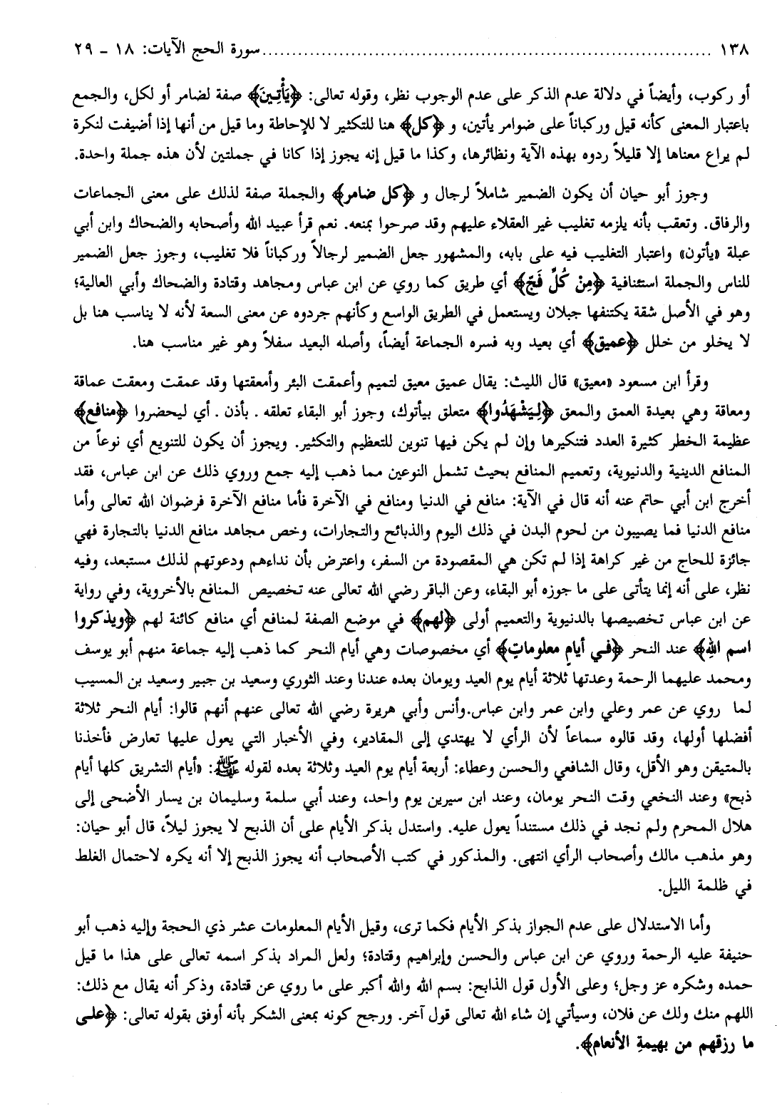 وجوز أبو حيان أن يكون الضمير شاملا لرجال وكُلِّ ضامِرٍ والجملة صفة لذلك على معنى الجماعات والرفاق. وتعقب بأنه يلزمه تغليب غير العقلاء عليهم وقد صرحوا بمنعه. نعم قرأ عبيد الله وأصحابه والضحاك وابن أبي عبلة «يأتون» واعتبار التغليب فيه على بابه، والمشهور جعل الضمير لرجالا وركبانا فلا تغليب، وجوز جعل الضمير للناس والجملة استئنافية مِنْ كُلِّ فَجٍّ أي طريق كما روي عن ابن عباس ومجاهد وقتادة والضحاك وأبي العالية وهو في الأصل شقة يكتنفها جبلان ويستعمل في الطريق الواسع وكأنهم جردوه عن معنى السعة لأنه لا يناسب هنا بل لا يخلو من خلل عَمِيقٍ أي بعيد وبه فسره الجماعة أيضا، وأصله البعيد سفلا وهو غير مناسب هنا.