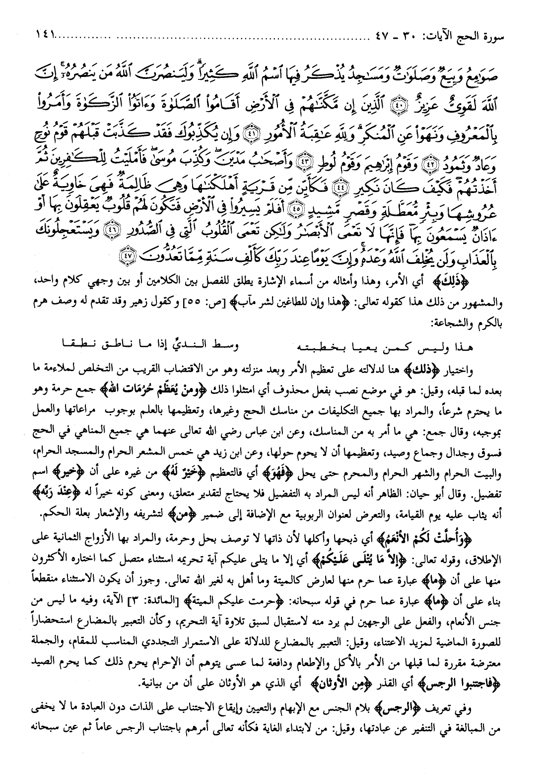 وَأُحِلَّتْ لَكُمُ الْأَنْعامُ أي ذبحها وأكلها لأن ذاتها لا توصف بحل وحرمة، والمراد بها الأزواج الثمانية على الإطلاق، وقوله تعالى: إِلَّا ما يُتْلى عَلَيْكُمْ أي إلا ما يتلى عليكم آية تحريمه استثناء متصل كما اختاره الأكثرون منها على أن ما عبارة عما حرم منها لعارض كالميتة وما أهل به لغير الله تعالى. وجوز أن يكون الاستثناء منقطعا بناء على أن ما عبارة عما حرم في قوله سبحانه: حُرِّمَتْ عَلَيْكُمُ الْمَيْتَةُ [المائدة: 3] الآية، وفيه ما ليس من جنس الأنعام، والفعل على الوجهين لم يرد منه لاستقبال لسبق تلاوة آية التحريم، وكأن التعبير بالمضارع استحضارا للصورة الماضية لمزيد الاعتناء، وقيل: التعبير بالمضارع للدلالة على الاستمرار التجددي المناسب للمقام، والجملة معترضة مقررة لما قبلها من الأمر بالأكل والإطعام ودافعة لما عسى يتوهم أن الإحرام يحرم ذلك كما يحرم الصيد فَاجْتَنِبُوا الرِّجْسَ أي القذر مِنَ الْأَوْثانِ أي الذي هو الأوثان على أن من بيانية.