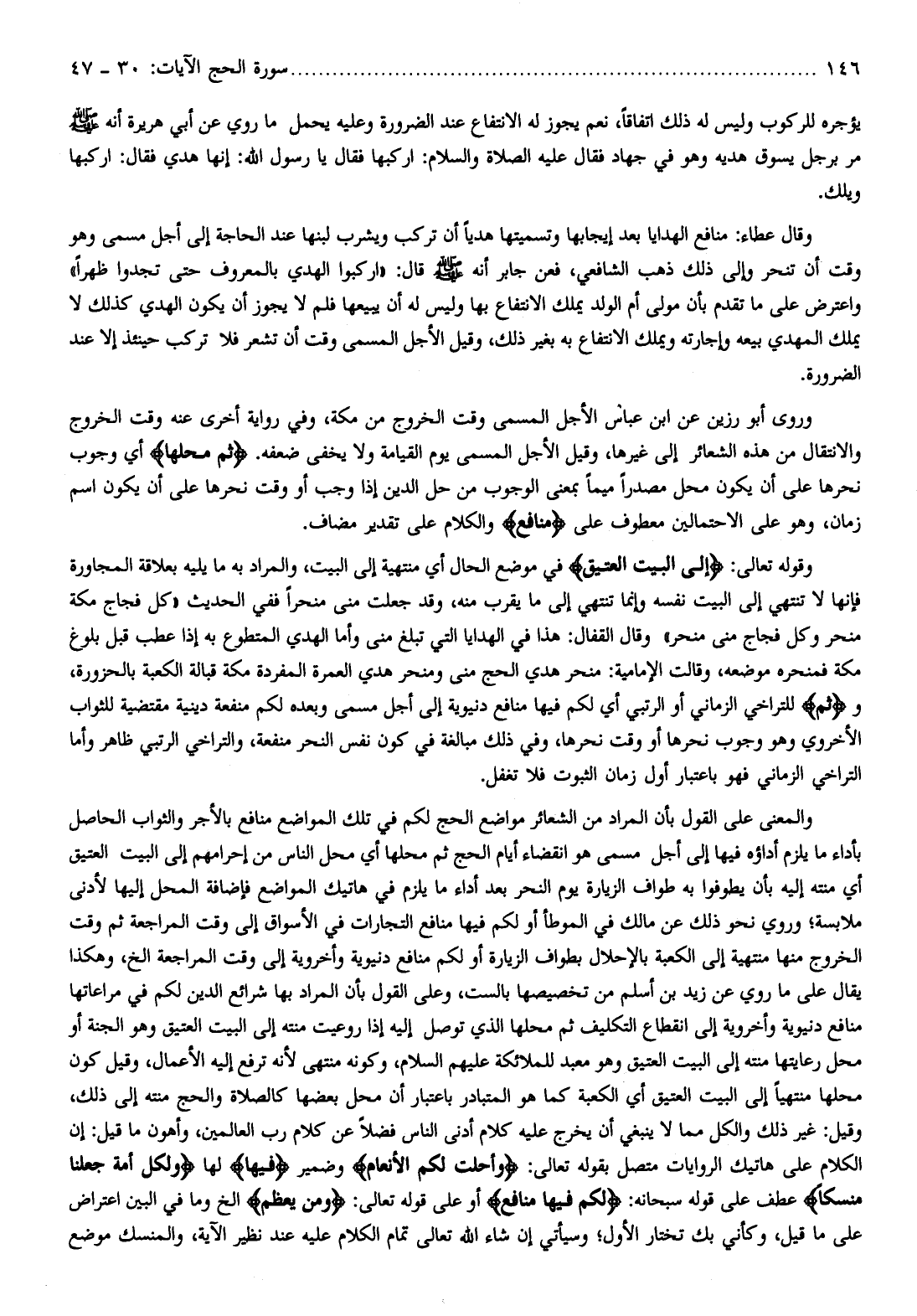 وقال القفال: هذا في الهدايا التي تبلغ منى وأما الهدي المتطوع به إذا عطب قبل بلوغ مكة فمنحره موضعه، وقالت الإمامية: منحر هدي الحج منى ومنحر هدي العمرة المفردة مكة قبالة الكعبة بالحزورة، وثُمَّ للتراخي الزماني أو الرتبي أي لكم فيها منافع دنيوية إلى أجل مسمى وبعده لكم منفعة دينية مقتضية للثواب الأخروي وهو وجوب نحرها أو وقت نحرها، وفي ذلك مبالغة في كون نفس النحر منفعة، والتراخي الرتبي ظاهر وأما التراخي الزماني فهو باعتبار أول زمان الثبوت فلا تغفل.