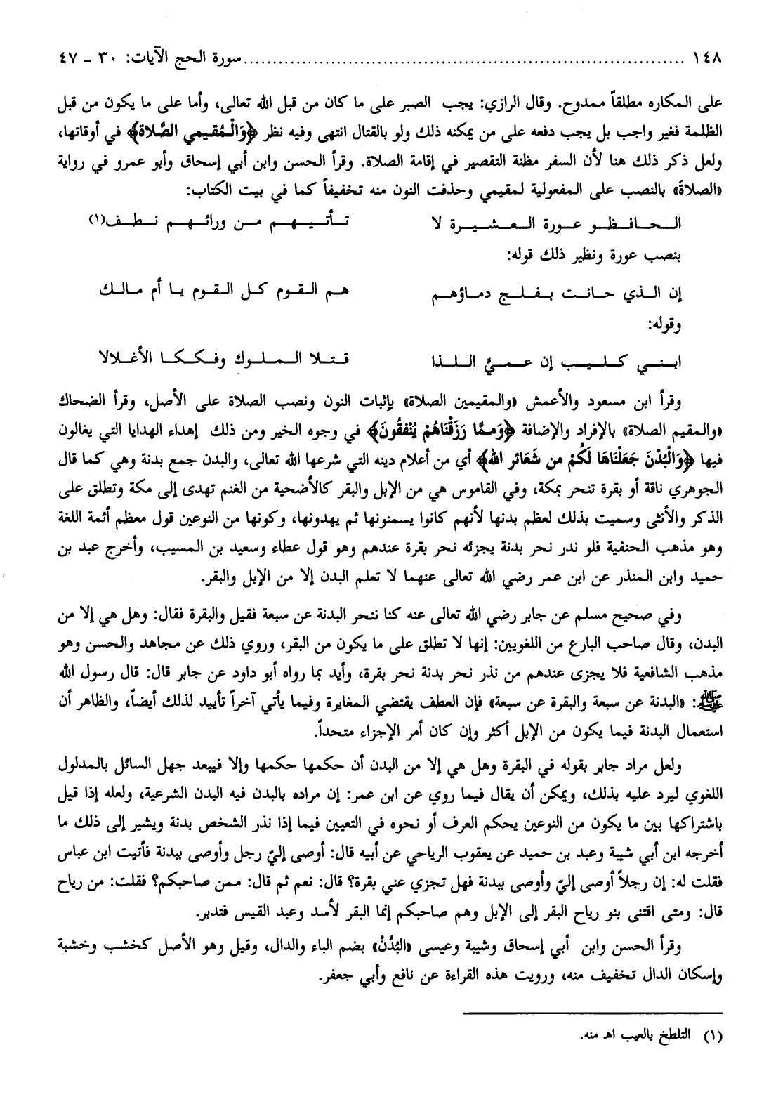 وقرأ ابن مسعود والأعمش «والمقيمين الصلاة» بإثبات النون ونصب الصلاة على الأصل، وقرأ الضحاك «والمقيم الصلاة» بالإفراد والإضافة وَمِمَّا رَزَقْناهُمْ يُنْفِقُونَ في وجوه الخير ومن ذلك إهداء الهدايا التي يغالون فيها وَالْبُدْنَ جَعَلْناها لَكُمْ مِنْ شَعائِرِ اللَّهِ أي من أعلام دينه التي شرعها الله تعالى، والبدن جمع بدنة وهي كما قال الجوهري ناقة أو بقرة تنحر بمكة، وفي القاموس هي من الإبل والبقر كالأضحية من الغنم تهدى إلى مكة وتطلق على الذكر والأنثى وسميت بذلك لعظم بدنها لأنهم كانوا يسمنونها ثم يهدونها، وكونها من النوعين قول معظم أئمة اللغة وهو مذهب الحنفية فلو ندر نحر بدنة يجزئه نحر بقرة عندهم وهو قول عطاء وسعيد بن المسيب، وأخرج عبد بن حميد وابن المنذر عن ابن عمر رضي الله تعالى عنهما لا تعلم البدن إلا من الإبل والبقر.