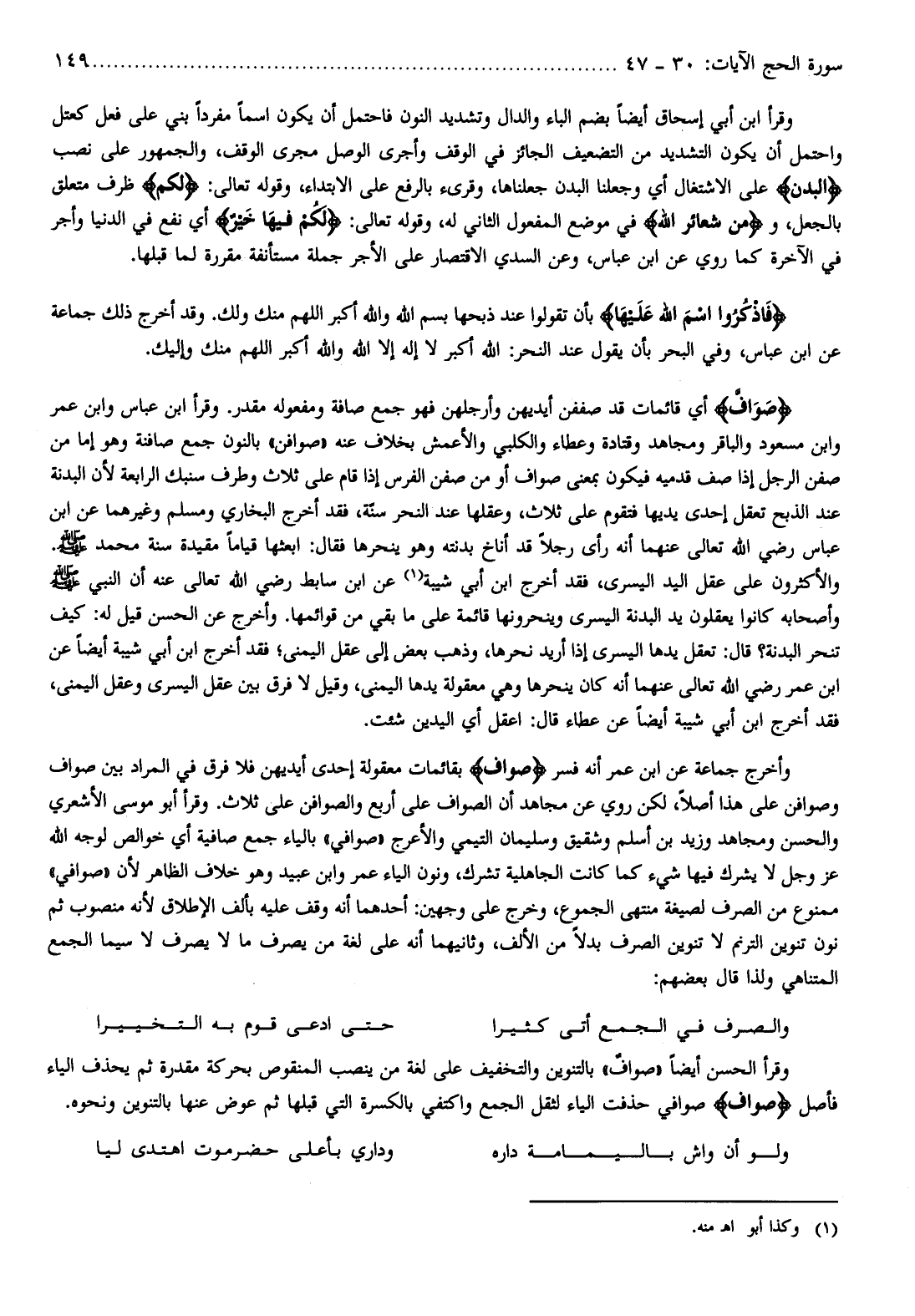 وأخرج جماعة عن ابن عمر أنه فسر صَوافَّ بقائمات معقولة إحدى أيديهن فلا فرق في المراد بين صواف وصوافن على هذا أصلا، لكن روي عن مجاهد أن الصواف على أربع والصوافن على ثلاث. وقرأ أبو موسى الأشعري والحسن ومجاهد وزيد بن أسلم وشقيق وسليمان التيمي والأعرج «صوافي» بالياء جمع صافية أي خوالص لوجه الله عز وجل لا يشرك فيها شيء كما كانت الجاهلية تشرك، ونون الياء عمر وابن عبيد وهو خلاف الظاهر لأن «صوافي» ممنوع من الصرف لصيغة منتهى الجموع، وخرج على وجهين: أحدهما أنه وقف عليه بألف الإطلاق لأنه منصوب ثم نون تنوين الترنم لا تنوين الصرف بدلا من الألف، وثانيهما أنه على لغة من يصرف ما لا يصرف لا سيما الجمع المتناهي ولذا قال بعضهم: