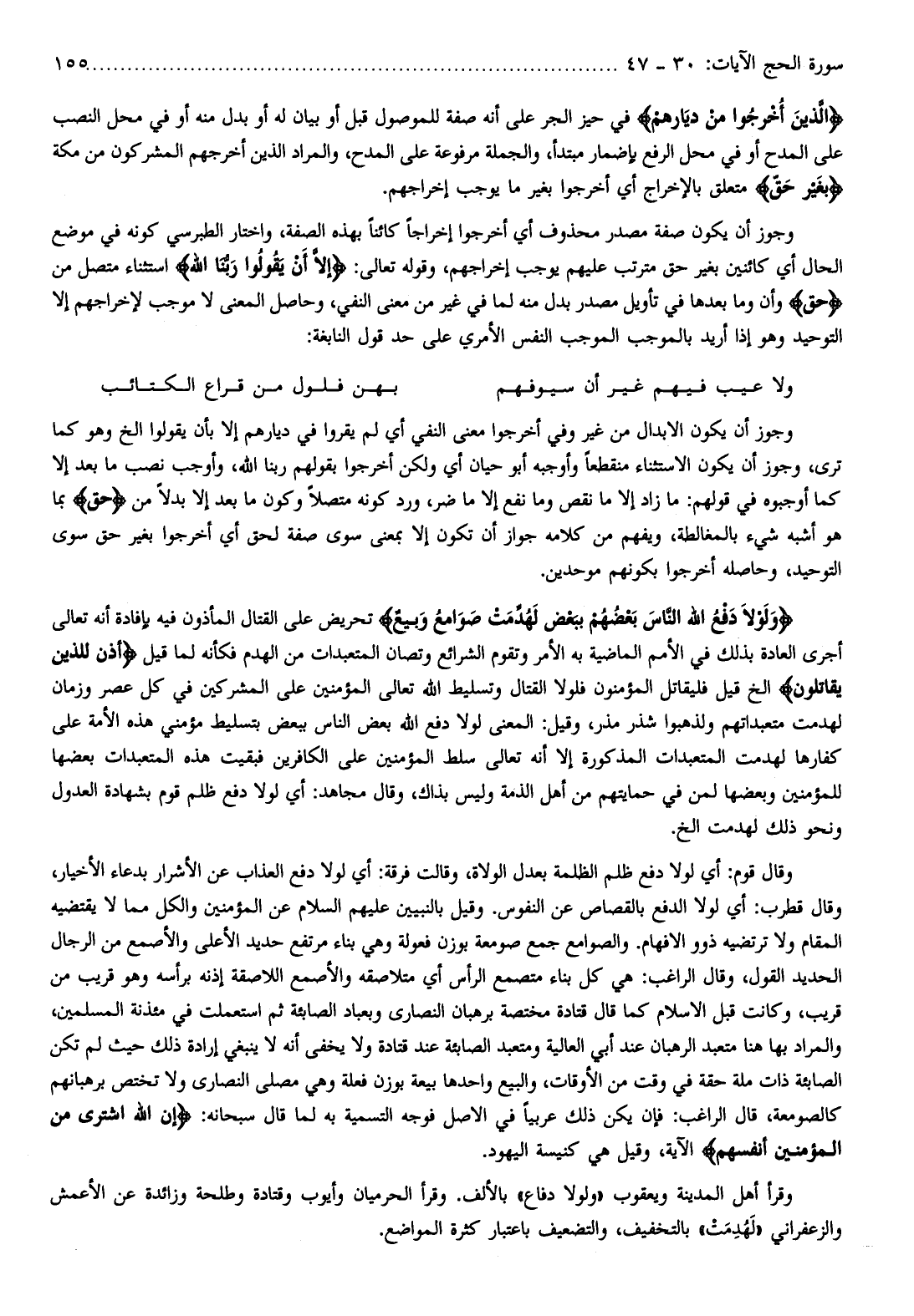 وَلَوْلا دَفْعُ اللَّهِ النَّاسَ بَعْضَهُمْ بِبَعْضٍ لَهُدِّمَتْ صَوامِعُ وَبِيَعٌ تحريض على القتال المأذون فيه بإفادة أنه تعالى أجرى العادة بذلك في الأمم الماضية به الأمر وتقوم الشرائع وتصان المتعبدات من الهدم فكأنه لما قيل أُذِنَ لِلَّذِينَ يُقاتَلُونَ إلخ قيل فليقاتل المؤمنون فلولا القتال وتسليط الله تعالى المؤمنين على المشركين في كل عصر وزمان لهدمت متعبداتهم ولذهبوا شذر مذر، وقيل: المعنى لولا دفع الله بعض الناس ببعض بتسليط مؤمني هذه الأمة على كفارها لهدمت المتعبدات المذكورة إلا أنه تعالى سلط المؤمنين على الكافرين فبقيت هذه المتعبدات بعضها للمؤمنين وبعضها لمن في حمايتهم من أهل الذمة وليس بذاك، وقال مجاهد: أي لولا دفع ظلم قوم بشهادة العدول ونحو ذلك لهدمت إلخ.