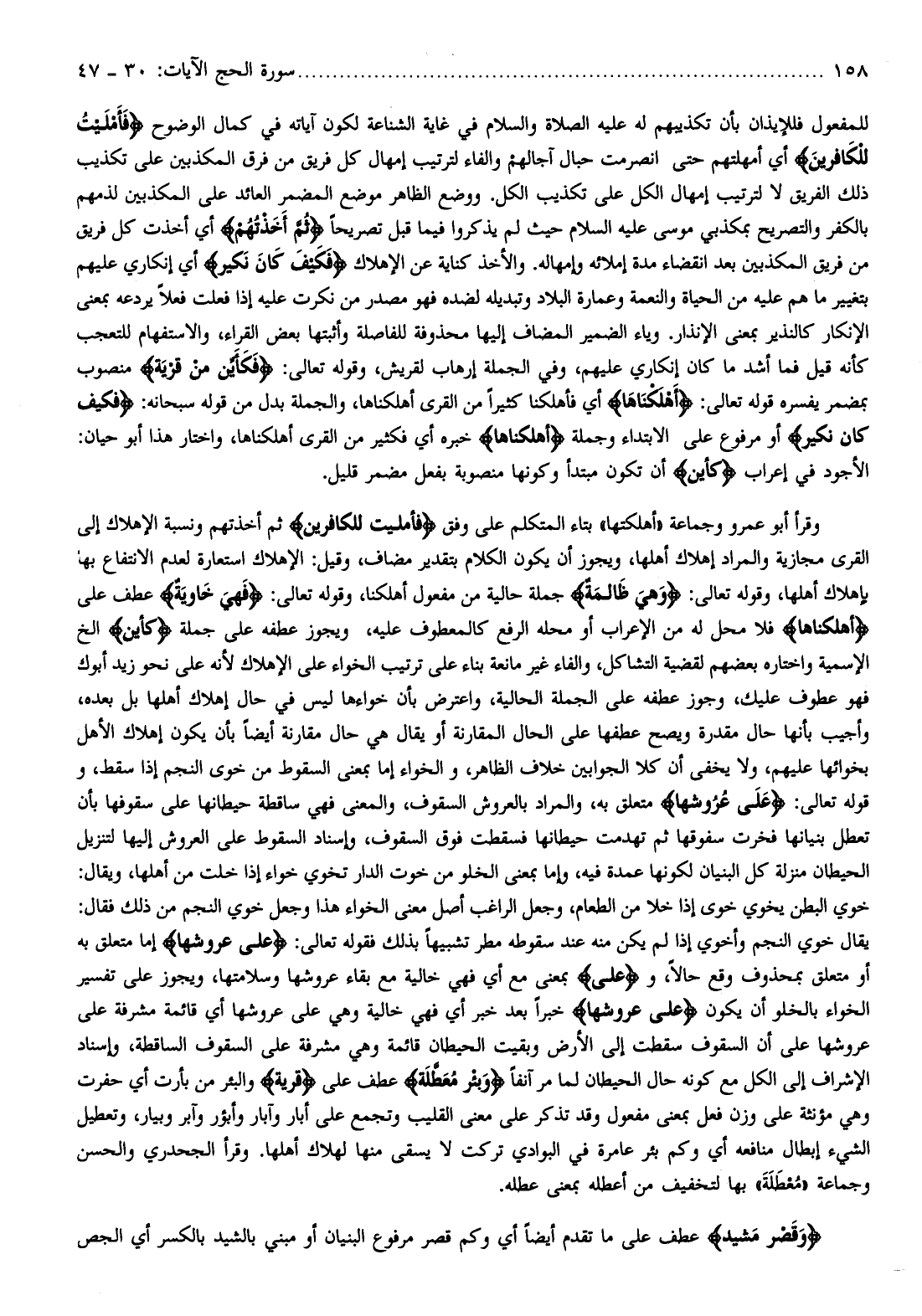 وقرأ أبو عمرو وجماعة «أهلكتها» بتاء المتكلم على وفق فَأَمْلَيْتُ لِلْكافِرِينَ ثم أخذتهم ونسبة الإهلاك إلى القرى مجازية والمراد إهلاك أهلها، ويجوز أن يكون الكلام بتقدير مضاف، وقيل: الإهلاك استعارة لعدم الانتفاع بها بإهلاك أهلها، وقوله تعالى: وَهِيَ ظالِمَةٌ جملة حالية من مفعول أهلكنا، وقوله تعالى: فَهِيَ خاوِيَةٌ عطف على أَهْلَكْناها فلا محل له من الإعراب أو محله الرفع كالمعطوف عليه، ويجوز عطفه على جملة (كأين) إلخ الاسمية واختاره بعضهم لقضية التشاكل، والفاء غير مانعة بناء على ترتيب الخواء على الإهلاك لأنه على نحو زيد أبوك فهو عطوف عليك، وجوز عطفه على الجملة الحالية، واعترض بأن خواءها ليس في حال إهلاك أهلها بل بعده، وأجيب بأنها حال مقدرة ويصح عطفها على الحال المقارنة أو يقال هي حال مقارنة أيضا بأن يكون إهلاك الأهل بخوائها عليهم، ولا يخفى أن كلا الجوابين خلاف الظاهر، والخواء إما بمعنى السقوط من خوى النجم إذا سقط، وقوله تعالى: عَلى عُرُوشِها متعلق به، والمراد بالعروش السقوف، والمعنى فهي ساقطة حيطانها على سقوفها بأن تعطل بنيانها فخرت سفوقها ثم تهدمت حيطانها فسقطت فوق السقوف، وإسناد السقوط على العروش إليها لتنزيل الحيطان منزلة كل البنيان لكونها عمدة فيه، وإما بمعنى الخلو من خوت الدار تخوي خواء إذا خلت من أهلها، ويقال: