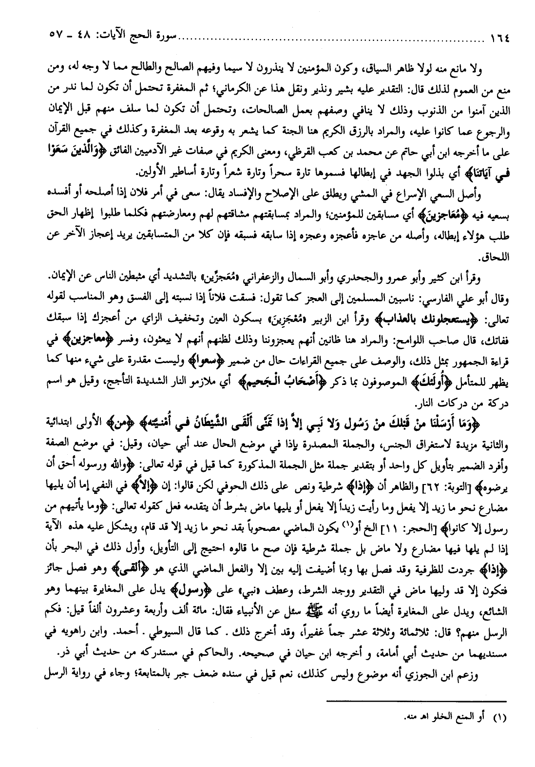 وَما أَرْسَلْنا مِنْ قَبْلِكَ مِنْ رَسُولٍ وَلا نَبِيٍّ إِلَّا إِذا تَمَنَّى أَلْقَى الشَّيْطانُ فِي أُمْنِيَّتِهِ مِنْ الأولى ابتدائية والثانية مزيدة لاستغراق الجنس، والجملة المصدرة بإذا في موضع الحال عند أبي حيان، وقيل: في موضع الصفة وأفرد الضمير بتأويل كل واحد أو بتقدير جملة مثل الجملة المذكورة كما قيل في قوله تعالى: وَاللَّهُ وَرَسُولُهُ أَحَقُّ أَنْ يُرْضُوهُ [التوبة: 62] والظاهر أن إِذا شرطية ونص على ذلك الحوفي لكن قالوا: إن إِلَّا في النفي إما أن يليها مضارع نحو ما زيد إلا يفعل وما رأيت زيدا إلا يفعل أو يليها ماض بشرط أن يتقدمه فعل كقوله تعالى: وَما يَأْتِيهِمْ مِنْ رَسُولٍ إِلَّا كانُوا [الحجر: 11] إلخ أو (¬1) يكون الماضي مصحوبا بقد نحو ما زيد إلا قد قام، ويشكل عليه هذه الآية إذا لم يلها فيها مضارع ولا ماض بل جملة شرطية فإن صح ما قالوه احتيج إلى التأويل، وأول ذلك في البحر بأن إِذا جردت للظرفية وقد فصل بها وبما أضيفت إليه بين إلا والفعل الماضي الذي هو أَلْقَى وهو فصل جائز فتكون إلا قد وليها ماض في التقدير ووجد الشرط، وعطف «نبي» على رَسُولٍ يدل على المغايرة بينهما وهو الشائع، ويدل على المغايرة أيضا ما