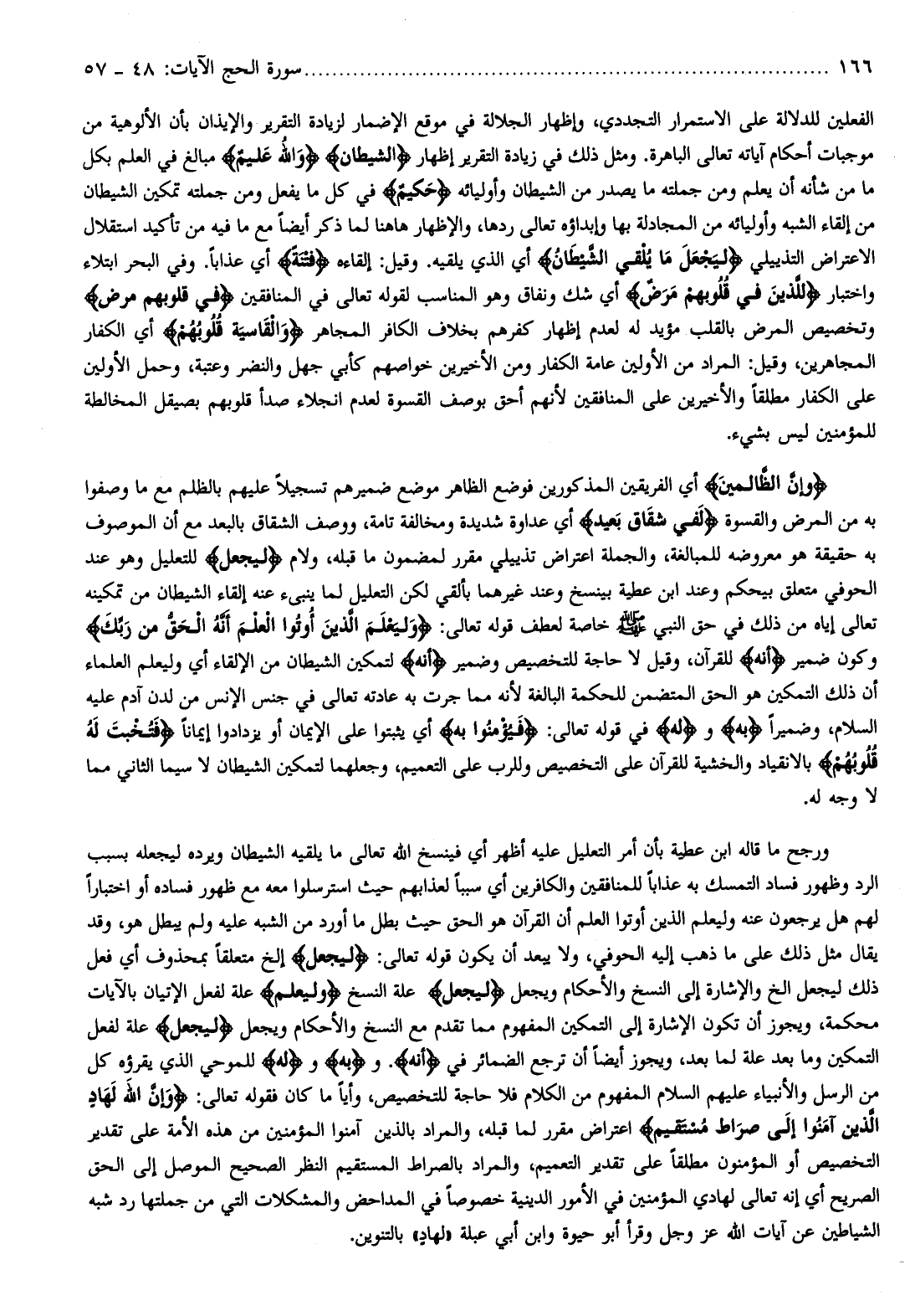 الفعلين للدلالة على الاستمرار التجددي، وإظهار الجلالة في موقع الإضمار لزيادة التقرير والإيذان بأن الألوهية من موجبات أحكام آياته تعالى الباهرة. ومثل ذلك في زيادة التقرير إظهار الشَّيْطانُ وَاللَّهُ عَلِيمٌ مبالغ في العلم بكل ما من شأنه أن يعلم ومن جملته ما يصدر من الشيطان وأوليائه حَكِيمٌ في كل ما يفعل ومن جملته تمكين الشيطان من إلقاء الشبه وأوليائه من المجادلة بها وإبداؤه تعالى ردها، والإظهار هاهنا لما ذكر أيضا مع ما فيه من تأكيد استقلال الاعتراض التذييلي لِيَجْعَلَ ما يُلْقِي الشَّيْطانُ أي الذي يلقيه. وقيل: إلقاءه فِتْنَةً أي عذابا. وفي البحر ابتلاء واختبار لِلَّذِينَ فِي قُلُوبِهِمْ مَرَضٌ أي شك ونفاق وهو المناسب لقوله تعالى في المنافقين فِي قُلُوبِهِمْ مَرَضٌ وتخصيص المرض بالقلب مؤيد له لعدم إظهار كفرهم بخلاف الكافر المجاهر وَالْقاسِيَةِ قُلُوبُهُمْ أي الكفار المجاهرين، وقيل: المراد من الأولين عامة الكفار ومن الأخيرين خواصهم كأبي جهل والنضر وعتبة، وحمل الأولين على الكفار مطلقا والأخيرين على المنافقين لأنهم أحق بوصف القسوة لعدم انجلاء صدأ قلوبهم بصيقل المخالطة للمؤمنين ليس بشيء.