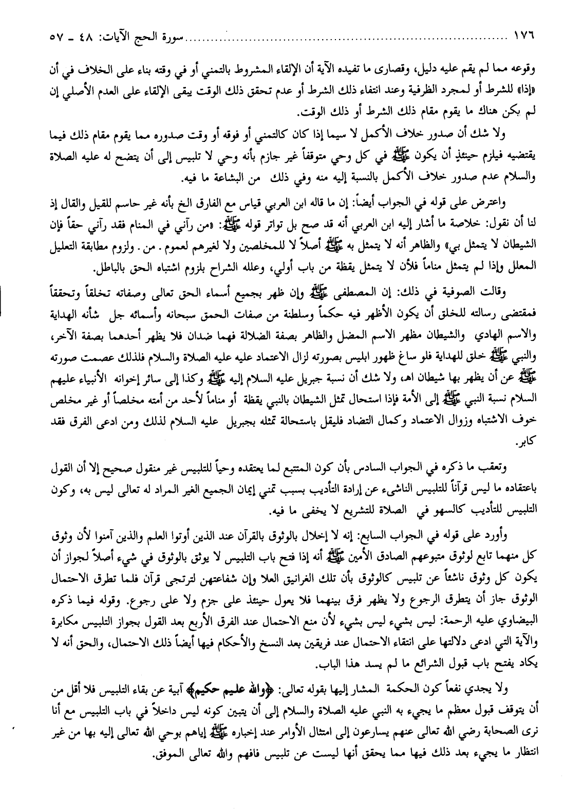 وأورد على قوله في الجواب السابع: إنه لا إخلال بالوثوق بالقرآن عند الذين أوتوا العلم والذين آمنوا لأن وثوق كل منهما تابع لوثوق متبوعهم الصادق الأمين صلّى الله عليه وسلّم أنه إذا فتح باب التلبيس لا يوثق بالوثوق في شيء أصلا لجواز أن يكون كل وثوق ناشئا عن تلبيس كالوثوق بأن تلك الغرانيق العلا وإن شفاعتهن لترتجى قرآن فلما تطرق الاحتمال الوثوق جاز أن يتطرق الرجوع ولا يظهر فرق بينهما فلا يعول حينئذ على جزم ولا على رجوع. وقوله فيما ذكره البيضاوي عليه الرحمة: ليس بشيء ليس بشيء لأن منع الاحتمال عند الفرق الأربع بعد القول بجواز التلبيس مكابرة والآية التي ادعى دلالتها على انتقاء الاحتمال عند فريقين بعد النسخ والأحكام فيها أيضا ذلك الاحتمال، والحق أنه لا يكاد يفتح باب قبول الشرائع ما لم يسد هذا الباب.