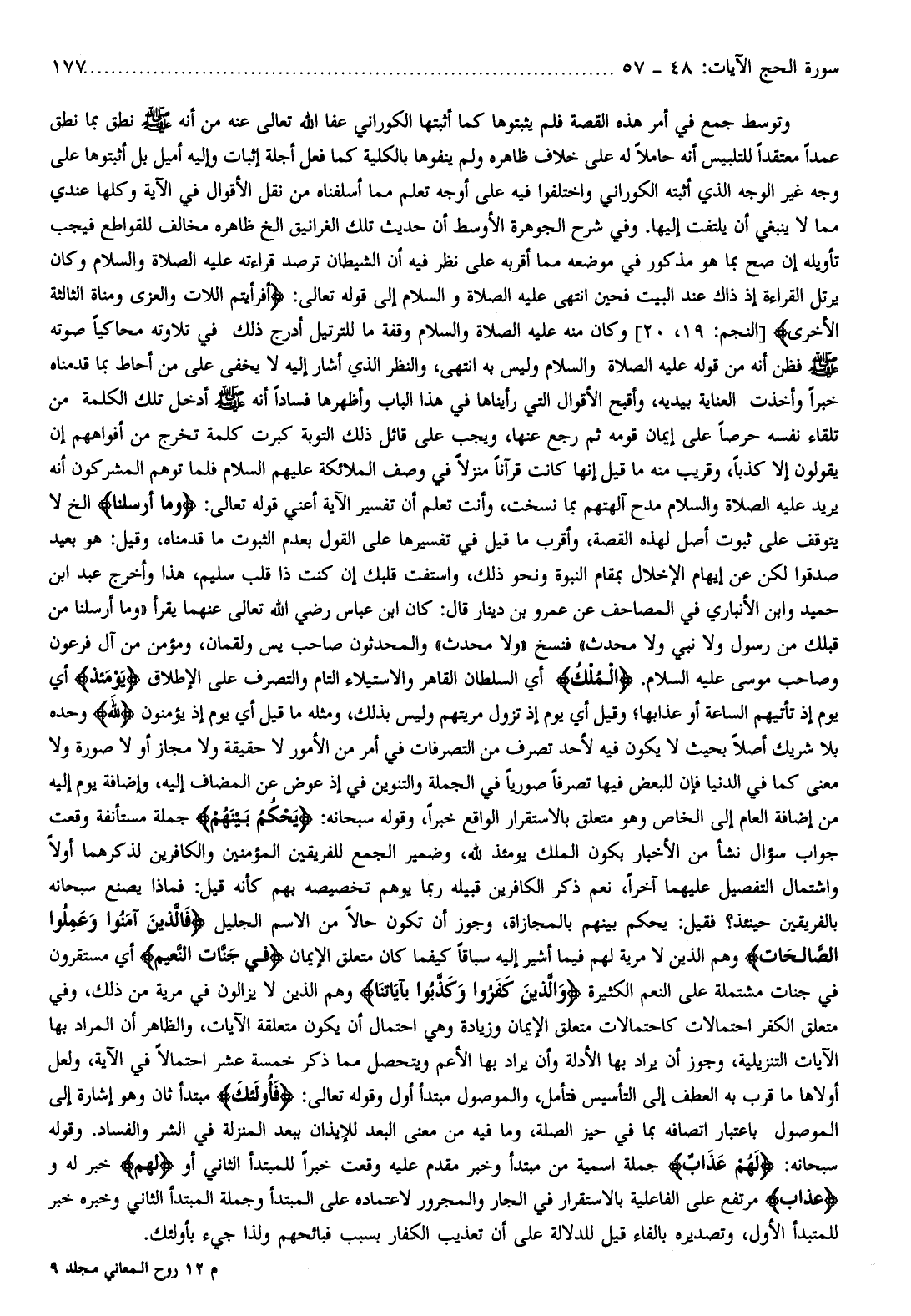 وتوسط جمع في أمر هذه القصة فلم يثبتوها كما أثبتها الكوراني عفا الله تعالى عنه من أنه صلّى الله عليه وسلّم نطق بما نطق عمدا معتقدا للتلبيس أنه حاملا له على خلاف ظاهره ولم ينفوها بالكلية كما فعل أجلة إثبات وإليه أميل بل أثبتوها على وجه غير الوجه الذي أثبته الكوراني واختلفوا فيه على أوجه تعلم مما أسلفناه من نقل الأقوال في الآية وكلها عندي مما لا ينبغي أن يلتفت إليها. وفي شرح الجوهرة الأوسط أن حديث تلك الغرانيق إلخ ظاهره مخالف للقواطع فيجب تأويله إن صح بما هو مذكور في موضعه مما أقربه على نظر فيه أن الشيطان ترصد قراءته عليه الصلاة والسلام وكان يرتل القراءة إذ ذاك عند البيت فحين انتهى عليه الصلاة والسلام إلى قوله تعالى: أَفَرَأَيْتُمُ اللَّاتَ وَالْعُزَّى وَمَناةَ الثَّالِثَةَ الْأُخْرى [النجم: 19، 20] وكان منه عليه الصلاة والسلام وقفة ما للترتيل أدرج ذلك في تلاوته محاكيا صوته صلّى الله عليه وسلّم فظن أنه من قوله عليه الصلاة والسلام وليس به انتهى، والنظر الذي أشار إليه لا يخفى على من أحاط بما قدمناه خبرا وأخذت العناية بيديه، وأقبح الأقوال التي رأيناها في هذا الباب وأظهرها فسادا أنه صلّى الله عليه وسلّم أدخل تلك الكلمة من تلقاء نفسه حرصا على إيمان قومه ثم رجع عنها، ويجب على قائل ذلك التوبة كبرت كلمة تخرج من أفواههم إن يقولون إلا كذبا، وقريب منه ما قيل إنها كانت قرآنا منزلا في وصف الملائكة عليهم السلام فلما توهم المشركون أنه يريد عليه الصلاة والسلام مدح آلهتهم بما نسخت، وأنت تعلم أن تفسير الآية أعني قوله تعالى: وَما أَرْسَلْنا إلخ لا يتوقف على ثبوت أصل لهذه القصة، وأقرب ما قيل في تفسيرها على القول بعدم الثبوت ما قدمناه، وقيل: هو بعيد صدقوا لكن عن إيهام الإخلال بمقام النبوة ونحو ذلك، واستفت قلبك إن كنت ذا قلب سليم، هذا وأخرج عبد ابن حميد وابن الأنباري في المصاحف عن عمرو بن دينار قال: كان ابن عباس رضي الله تعالى عنهما يقرأ «وما أرسلنا من قبلك من رسول ولا نبي ولا محدث» فنسخ «ولا محدث» والمحدثون صاحب يس ولقمان، ومؤمن من آل فرعون وصاحب موسى عليه السلام. الْمُلْكُ أي السلطان القاهر والاستيلاء التام والتصرف على الإطلاق يَوْمَئِذٍ أي يوم إذ تأتيهم الساعة أو عذابها وقيل أي يوم إذ تزول مريتهم وليس بذلك، ومثله ما قيل أي يوم إذ يؤمنون لِلَّهِ وحده بلا شريك أصلا بحيث لا يكون فيه لأحد تصرف من التصرفات في أمر من الأمور لا حقيقة ولا مجاز أو لا صورة ولا معنى كما في الدنيا فإن للبعض فيها تصرفا صوريا في الجملة والتنوين في إذ عوض عن المضاف إليه، وإضافة يوم إليه من إضافة العام إلى الخاص وهو متعلق بالاستقرار الواقع خبرا، وقوله سبحانه: يَحْكُمُ بَيْنَهُمْ جملة مستأنفة وقعت جواب سؤال نشأ من الأخبار بكون الملك يومئذ لله، وضمير الجمع للفريقين المؤمنين والكافرين لذكرهما أولا واشتمال التفصيل عليهما آخرا، نعم ذكر الكافرين قبيله ربما يوهم تخصيصه بهم كأنه قيل: فماذا يصنع سبحانه بالفريقين حينئذ؟ فقيل: يحكم بينهم بالمجازاة، وجوز أن تكون حالا من الاسم الجليل فَالَّذِينَ آمَنُوا وَعَمِلُوا الصَّالِحاتِ وهم الذين لا مرية لهم فيما أشير إليه سباقا كيفما كان متعلق الإيمان فِي جَنَّاتِ النَّعِيمِ أي مستقرون في جنات مشتملة على النعم الكثيرة وَالَّذِينَ كَفَرُوا وَكَذَّبُوا بِآياتِنا وهم الذين لا يزالون في مرية من ذلك، وفي متعلق الكفر احتمالات كاحتمالات متعلق الإيمان وزيادة وهي احتمال أن يكون متعلقة الآيات، والظاهر أن المراد بها الآيات التنزيلية، وجوز أن يراد بها الأدلة وأن يراد بها الأعم ويتحصل مما ذكر خمسة عشر