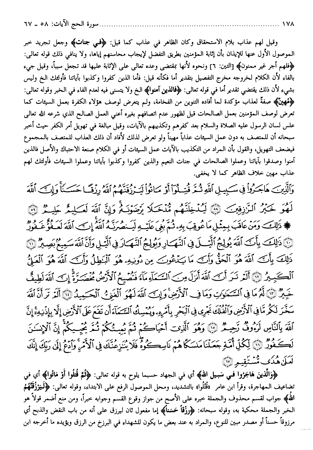وَالَّذِينَ هاجَرُوا فِي سَبِيلِ اللَّهِ أي في الجهاد حسبما يلوح به قوله تعالى: ثُمَّ قُتِلُوا أَوْ ماتُوا أي في تضاعيف المهاجرة، وقرأ ابن عامر «قتلوا» بالتشديد، ومحل الموصول الرفع على الابتداء، وقوله تعالى: لَيَرْزُقَنَّهُمُ اللَّهُ جواب لقسم محذوف والجملة خبره على الأصح من جواز وقوع القسم وجوابه خبرا، ومن منع أضمر قولا هو الخبر والجملة محكية به، وقوله سبحانه: رِزْقاً حَسَناً إما مفعول ثان ليرزق على أنه من باب النقض والذبح أي مرزوقا حسنا أو مصدر مبين للنوع، والمراد به عند بعض ما يكون للشهداء في البرزخ من الرزق ويؤيده ما