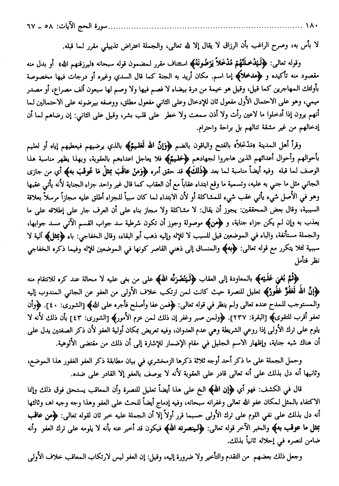 وقرأ أهل المدينة «مدخلا» بالفتح والباقون بالضم وَإِنَّ اللَّهَ لَعَلِيمٌ بالذي يرضيهم فيعطيهم إياه أو لعليم بأحوالهم وأحوال أعدائهم الذين هاجروا لجهادهم حَلِيمٌ فلا يعاجل أعداءهم بالعقوبة، وبهذا يظهر مناسبة هذا الوصف لما قبله وفيه أيضا مناسبة لما بعد ذلِكَ قد حقق أمره وَمَنْ عاقَبَ بِمِثْلِ ما عُوقِبَ بِهِ أي من جازى الجاني مثل ما جني به عليه، وتسمية ما وقع ابتداء عقابا مع أن العقاب كما قال غير واحد جزاء الجناية لأنه يأتي عقبها وهو في الأصل شيء يأتي عقب شيء للمشاكلة أو لأن الابتداء لما كان سببا للجزاء أطلق عليه مجازا مرسلا بعلاقة السببية، وقال بعض المحققين: يجوز أن يقال: لا مشاكلة ولا مجاز بناء على أن العرف جار على إطلاقه على ما يعذب به وإن لم يكن جزاء جناية، ومَنْ موصولة وجوز أن تكون شرطية سد جواب القسم الآتي مسد جوابها، والجملة مستأنفة، والباء في الموضعين قيل للسبب لا للإله وإليه ذهب أبو البقاء، وقال الخفاجي: باء بِمِثْلِ آلية لا سببية لئلا يتكرر مع قوله تعالى: بِهِ والمنساق إلى ذهني القاصر كونها في الموضعين للإله وفيما ذكره الخفاجي نظر فتأمل ثُمَّ بُغِيَ عَلَيْهِ بالمعاودة إلى العقاب لَيَنْصُرَنَّهُ اللَّهُ على من بغى عليه لا محالة عند كره للانتقام منه إِنَّ اللَّهَ لَعَفُوٌّ غَفُورٌ تعليل للنصرة حيث كانت لمن ارتكب خلاف الأولى من العفو عن الجاني المندوب إليه والمستوجب للمدح عنده تعالى ولم ينظر في قوله تعالى: فَمَنْ عَفا وَأَصْلَحَ فَأَجْرُهُ عَلَى اللَّهِ [الشورى: 40] . وَأَنْ تَعْفُوا أَقْرَبُ لِلتَّقْوى [البقرة: 237] . وَلَمَنْ صَبَرَ وَغَفَرَ إِنَّ ذلِكَ لَمِنْ عَزْمِ الْأُمُورِ [الشورى: 43] بأن ذلك لأنه لا يلوم على ترك الأولى إذا روعي الشريطة وهي عدم العدوان، وفيه تعريض بمكان أولية العفو لأن ذكر الصفتين يدل على أن هناك شبه جناية، وإظهار الاسم الجليل في مقام الإضمار للإشارة إلى أن ذلك من مقتضى الألوهية.