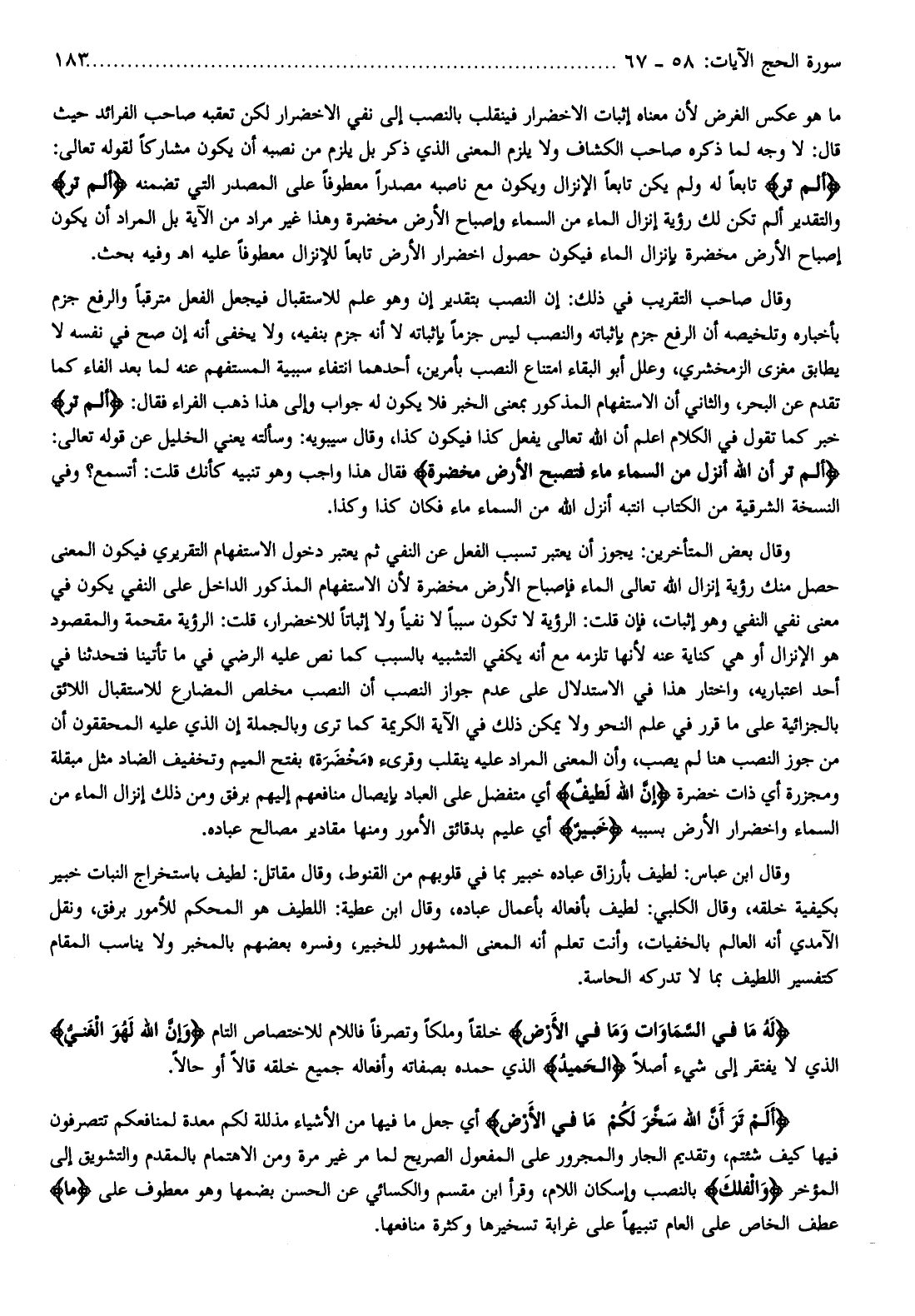 وقال بعض المتأخرين: يجوز أن يعتبر تسبب الفعل عن النفي ثم يعتبر دخول الاستفهام التقريري فيكون المعنى حصل منك رؤية إنزال الله تعالى الماء فإصباح الأرض مخضرة لأن الاستفهام المذكور الداخل على النفي يكون في معنى نفي النفي وهو إثبات، فإن قلت: الرؤية لا تكون سببا لا نفيا ولا إثباتا للاخضرار، قلت: الرؤية مقحمة والمقصود هو الإنزال أو هي كناية عنه لأنها تلزمه مع أنه يكفي التشبيه بالسبب كما نص عليه الرضي في ما تأتينا فتحدثنا في أحد اعتباريه، واختار هذا في الاستدلال على عدم جواز النصب أن النصب مخلص المضارع للاستقبال اللائق بالجزائية على ما قرر في علم النحو ولا يمكن ذلك في الآية الكريمة كما ترى وبالجملة إن الذي عليه المحققون أن من جوز النصب هنا لم يصب، وأن المعنى المراد عليه ينقلب وقرىء «مخضرة» بفتح الميم وتخفيف الضاد مثل مبقلة ومجزرة أي ذات خضرة إِنَّ اللَّهَ لَطِيفٌ أي متفضل على العباد بإيصال منافعهم إليهم برفق ومن ذلك إنزال الماء من السماء واخضرار الأرض بسببه خَبِيرٌ أي عليم بدقائق الأمور ومنها مقادير مصالح عباده.