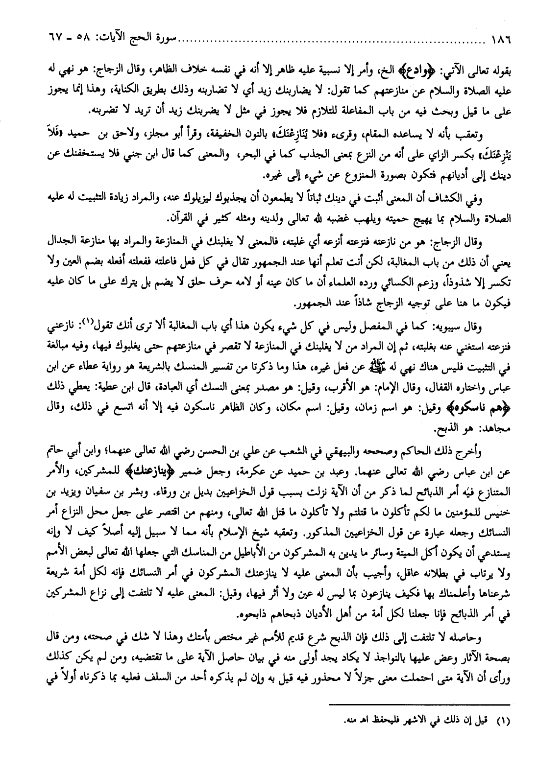 وأخرج ذلك الحاكم وصححه والبيهقي في الشعب عن علي بن الحسن رضي الله تعالى عنهما وابن أبي حاتم عن ابن عباس رضي الله تعالى عنهما. وعبد بن حميد عن عكرمة، وجعل ضمير يُنازِعُنَّكَ للمشركين، والأمر المتنازع فيه أمر الذبائح لما ذكر من أن الآية نزلت بسبب قول الخزاعيين بديل بن ورقاء. وبشر بن سفيان ويزيد بن خنيس للمؤمنين ما لكم تأكلون ما قتلتم ولا تأكلون ما قتل الله تعالى، ومنهم من اقتصر على جعل محل النزاع أمر النسائك وجعله عبارة عن قول الخزاعيين المذكور. وتعقبه شيخ الإسلام بأنه مما لا سبيل إليه أصلا كيف لا وإنه يستدعي أن يكون أكل الميتة وسائر ما يدين به المشركون من الأباطيل من المناسك التي جعلها الله تعالى لبعض الأمم ولا يرتاب في بطلانه عاقل، وأجيب بأن المعنى عليه لا ينازعنك المشركون في أمر النسائك فإنه لكل أمة شريعة شرعناها وأعلمناك بها فكيف ينازعون بما ليس له عين ولا أثر فيها، وقيل: المعنى عليه لا تلتفت إلى نزاع المشركين في أمر الذبائح فإنا جعلنا لكل أمة من أهل الأديان ذبحاهم ذابحوه.