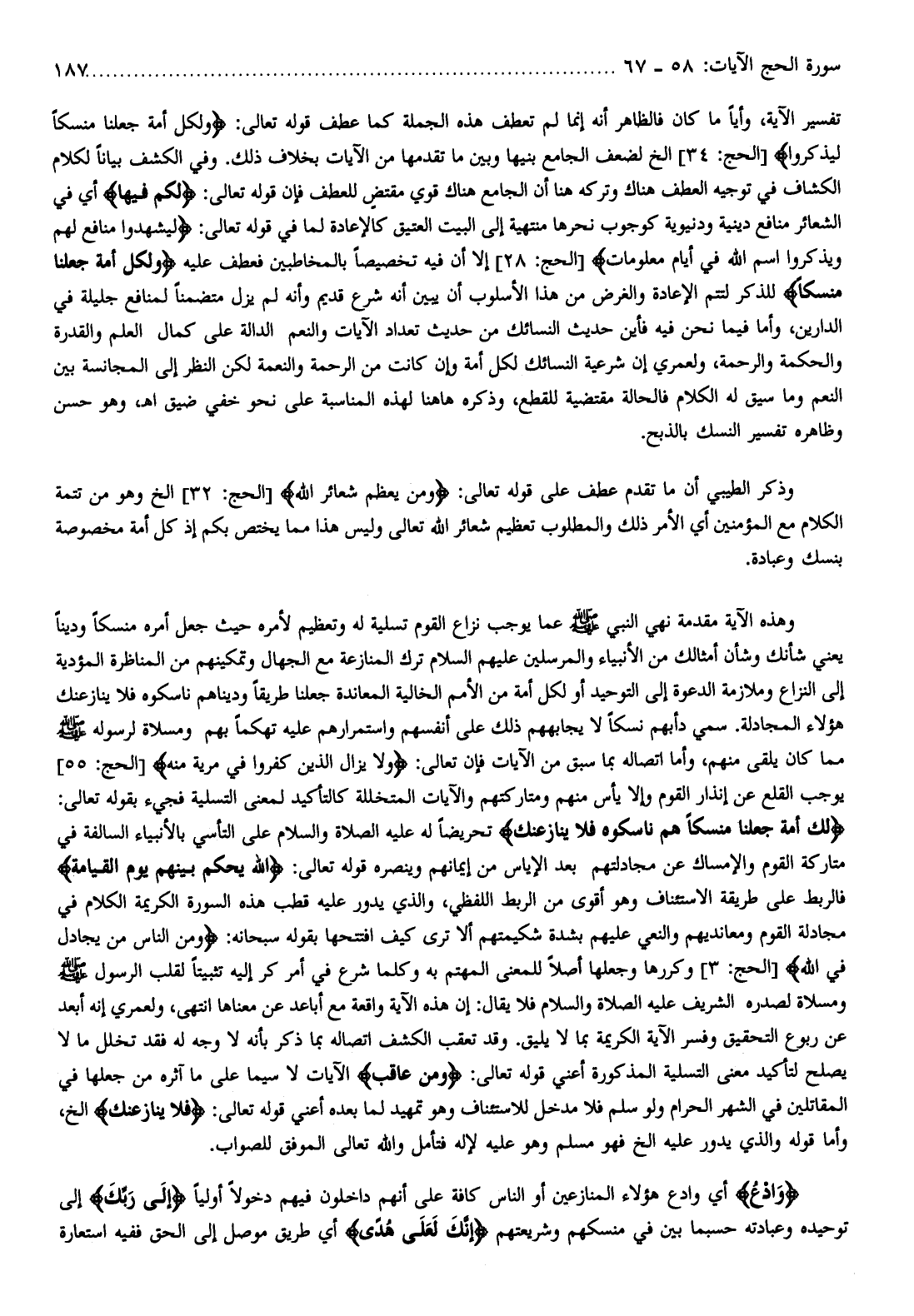 تفسير الآية، وأيا ما كان فالظاهر أنه إنما لم تعطف هذه الجملة كما عطف قوله تعالى: وَلِكُلِّ أُمَّةٍ جَعَلْنا مَنْسَكاً لِيَذْكُرُوا [الحج: 34] إلخ لضعف الجامع بنيها وبين ما تقدمها من الآيات بخلاف ذلك. وفي الكشف بيانا لكلام الكشاف في توجيه العطف هناك وتركه هنا أن الجامع هناك قوي مقتض للعطف فإن قوله تعالى: لَكُمْ فِيها أي في الشعائر منافع دينية ودنيوية كوجوب نحرها منتهية إلى البيت العتيق كالإعادة لما في قوله تعالى: لِيَشْهَدُوا مَنافِعَ لَهُمْ وَيَذْكُرُوا اسْمَ اللَّهِ فِي أَيَّامٍ مَعْلُوماتٍ [الحج: 28] إلا أن فيه تخصيصا بالمخاطبين فعطف عليه وَلِكُلِّ أُمَّةٍ جَعَلْنا مَنْسَكاً للذكر لتتم الإعادة والغرض من هذا الأسلوب أن يبين أنه شرع قديم وأنه لم يزل متضمنا لمنافع جليلة في الدارين، وأما فيما نحن فيه فأين حديث النسائك من حديث تعداد الآيات والنعم الدالة على كمال العلم والقدرة والحكمة والرحمة، ولعمري إن شرعية النسائك لكل أمة وإن كانت من الرحمة والنعمة لكن النظر إلى المجانسة بين النعم وما سيق له الكلام فالحالة مقتضية للقطع، وذكره هاهنا لهذه المناسبة على نحو خفي ضيق اهـ، وهو حسن وظاهره تفسير النسك بالذبح.