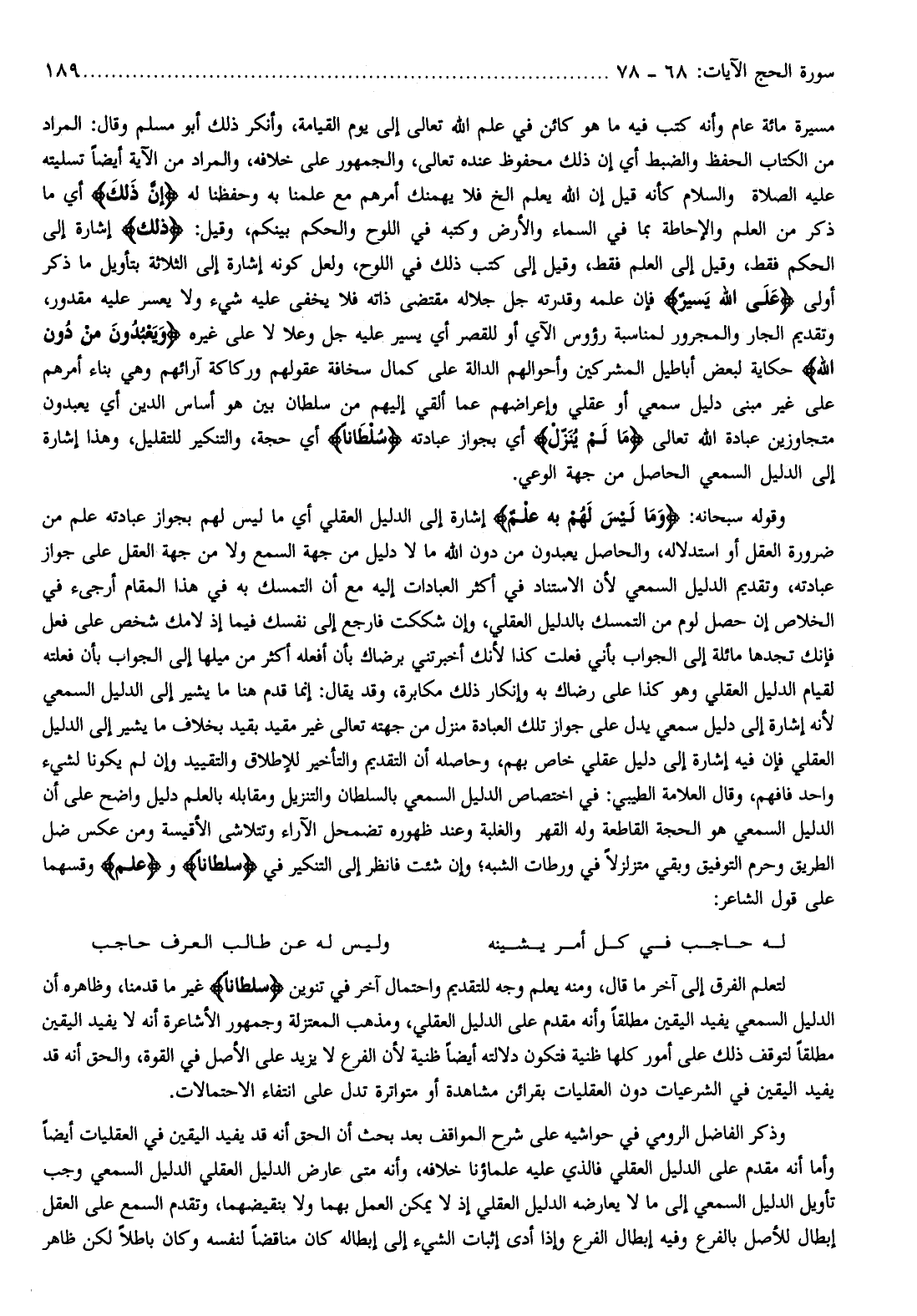 لتعلم الفرق إلى آخر ما قال، ومنه يعلم وجه للتقديم واحتمال آخر في تنوين سُلْطاناً غير ما قدمنا، وظاهره أن الدليل السمعي يفيد اليقين مطلقا وأنه مقدم على الدليل العقلي، ومذهب المعتزلة وجمهور الأشاعرة أنه لا يفيد اليقين مطلقا لتوقف ذلك على أمور كلها ظنية فتكون دلالته أيضا ظنية لأن الفرع لا يزيد على الأصل في القوة، والحق أنه قد يفيد اليقين في الشرعيات دون العقليات بقرائن مشاهدة أو متواترة تدل على انتفاء الاحتمالات.