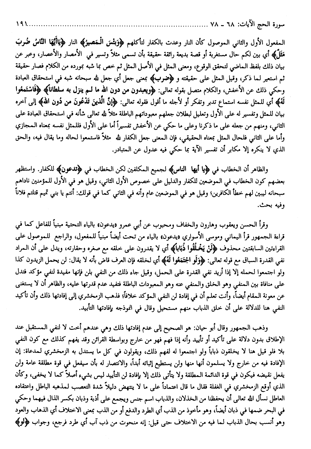 وقرأ الحسن ويعقوب وهارون والخفاف ومحبوب عن أبي عمرو «يدعون» بالياء التحتية مبنيا للفاعل كما في قراءة الجمهور قرأ اليماني وموسى الأسواري «يدعون» بالياء من تحت أيضا مبنيا للمفعول، والراجع للموصول على القراءتين السابقتين محذوف لَنْ يَخْلُقُوا ذُباباً أي لا يقدرون على خلقه مع صغره وحقارته، ويدل على أن المراد نفي القدرة السباق مع قوله تعالى: وَلَوِ اجْتَمَعُوا لَهُ أي لخلقه فإن العرف قاض بأنه لا يقال: لن يحمل الزيدون كذا ولو اجتمعوا لحمله إلا إذا أريد نفي القدرة على الحمل، وقيل جاء ذلك من النفي بلن فإنها مفيدة لنفي مؤكد فتدل على منافاة بين المنفي وهو الخلق والمنفي عنه وهو المعبودات الباطلة فتفيد عدم قدرتها عليه، والظاهر أن لا يستغنى عن معونة المقام أيضا، وأنت تعلم أن في إفادة لن النفي المؤكد خلافا فذهب الزمخشري إلى إفادتها ذلك وأن تأكيد النفي هنا للدلالة على أن خلق الذباب منهم مستحيل وقال في أنموذجه بإفادتها التأبيد.