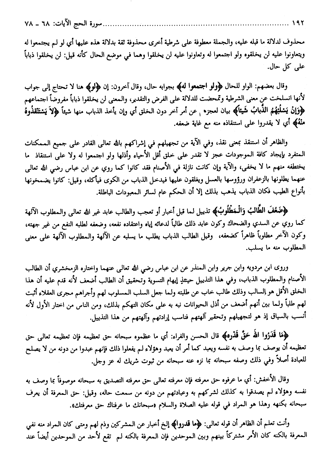 ضَعُفَ الطَّالِبُ وَالْمَطْلُوبُ تذييل لما قبل أخبار أو تعجب والطالب عابد غير الله تعالى والمطلوب الآلهة كما روي عن السدي والضحاك وكون عابد ذلك طالبا لدعائه إياه واعتقاده نفعه، وضعفه لطلبه النفع من غير جهته، وكون الآخر مطلوبا ظاهرا كضعفه، وقيل الطالب الذباب يطلب ما يسلبه عن الآلهة والمطلوب الآلهة على معنى المطلوب منه ما يسلب.