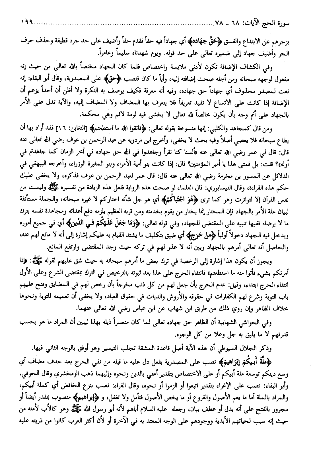 ومن قال كمجاهد والكلبي: إنها منسوخة بقوله تعالى: فَاتَّقُوا اللَّهَ مَا اسْتَطَعْتُمْ [التغابن: 16] فقد أراد بها أن يطاع سبحانه فلا يعصي أصلا وفيه بحث لا يخفى، وأخرج ابن مردويه عن عبد الرحمن بن عوف رضي الله تعالى عنه قال: قال لي عمر رضي الله تعالى عنه «ألسنا كنا نقرأ وجاهدوا في الله حق جهاده في آخر الزمان كما جاهدتم في أوله» ؟ قلت: بل فمتى هذا يا أمير المؤمنين؟ قال: إذا كانت بنو أمية الأمراء وبنو المغيرة الوزراء، وأخرجه البيهقي في الدلائل عن المسور بن مخرمة رضي الله تعالى عنه قال: قال عمر لعبد الرحمن بن عوف فذكره، ولا يخفى عليك حكم هذه القراءة، وقال النيسابوري: قال العلماء لو صحت هذه الرواية فلعل هذه الزيادة من تفسيره صلّى الله عليه وسلّم وليست من نفس القرآن إلا لتواترت وهو كما ترى هُوَ اجْتَباكُمْ أي هو جل شأنه اختاركم لا غيره سبحانه، والجملة مستأنفة لبيان علة الأمر بالجهاد فإن المختار إنما يختار من يقوم بخدمته ومن قربه العظيم يلزمه دفع أعدائه ومجاهدة نفسه بترك ما لا يرضاه ففيها تنبيه على المقتضى للجهاد، وفي قوله تعالى: وَما جَعَلَ عَلَيْكُمْ فِي الدِّينِ أي في جميع أموره ويدخل فيه الجهاد دخولا أوليا مِنْ حَرَجٍ أي ضيق بتكليف ما يشتد القيام به عليكم إشارة إلى أنه لا مانع لهم عنه، والحاصل أنه تعالى أمرهم بالجهاد وبين أنه لا عذر لهم في تركه حيث وجد المقتضى وارتفع المانع.