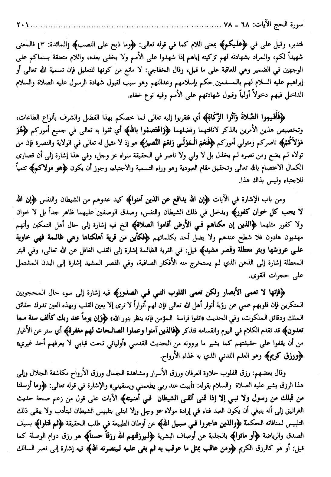 ومن باب الإشارة في الآيات إِنَّ اللَّهَ يُدافِعُ عَنِ الَّذِينَ آمَنُوا كيد عدوهم من الشيطان والنفس إِنَّ اللَّهَ لا يُحِبُّ كُلَّ خَوَّانٍ كَفُورٍ ويدخل في ذلك الشيطان والنفس، وصدق الوصفين عليهما ظاهر جدا بل لا خوان ولا كفور مثلهما الَّذِينَ إِنْ مَكَّنَّاهُمْ فِي الْأَرْضِ أَقامُوا الصَّلاةَ إلخ فيه إشارة إلى حال أهل التمكين وأنهم مهديون هادون فلا شطح عندهم ولا يضل أحد بكلماتهم فَكَأَيِّنْ مِنْ قَرْيَةٍ أَهْلَكْناها وَهِيَ ظالِمَةٌ فَهِيَ خاوِيَةٌ عَلى عُرُوشِها وَبِئْرٍ مُعَطَّلَةٍ وَقَصْرٍ مَشِيدٍ قيل: في القرية الظالمة إشارة إلى القلب الغافل عن الله تعالى، وفي البئر المعطلة إشارة إلى الذهن الذي لم يستخرج منه الأفكار الصافية، وفي القصر المشيد إشارة إلى البدن المشتمل على حجرات القوى.
