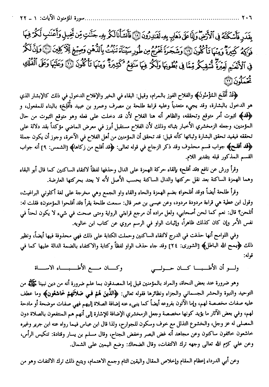وقرأ طلحة أيضا «وقد أفلحوا» بضم الهمزة والحاء وإلقاء واو الجمع وهي مخرجة على لغة أكلوني البراغيث، وقول ابن عطية هي قراءة مردودة مردود، وعن عيسى بن عمر قال: سمعت طلحة يقرأ «قد أفلحوا المؤمنون» فقلت له: