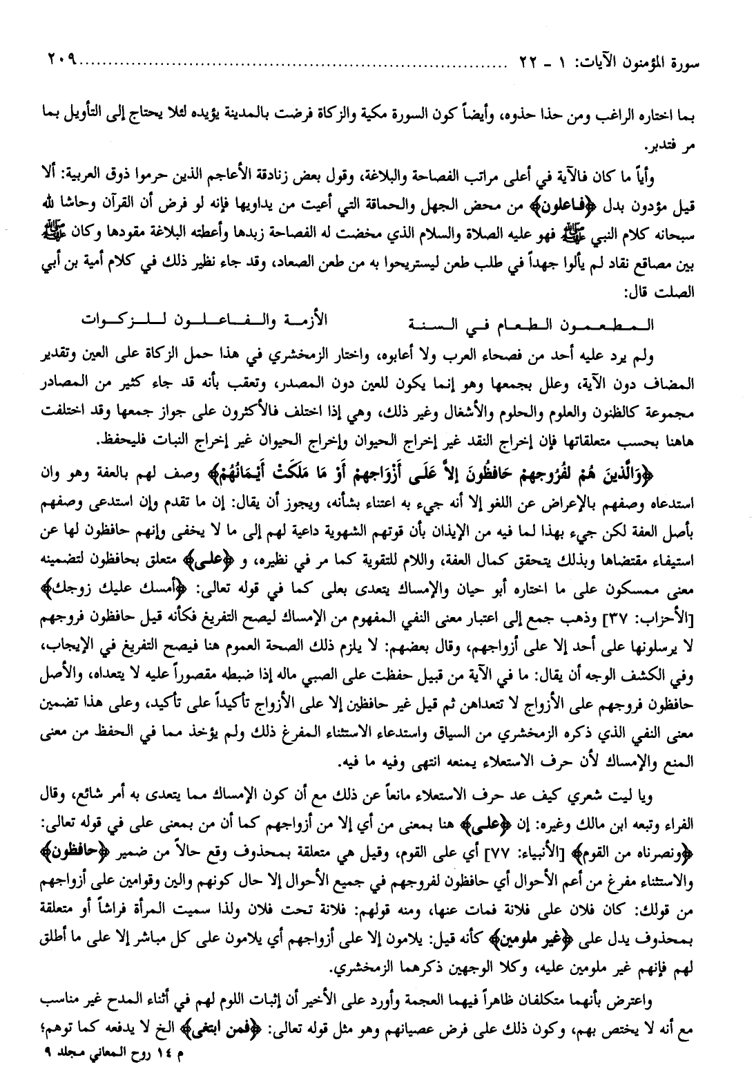 وَالَّذِينَ هُمْ لِفُرُوجِهِمْ حافِظُونَ إِلَّا عَلى أَزْواجِهِمْ أَوْ ما مَلَكَتْ أَيْمانُهُمْ وصف لهم بالعفة وهو وان استدعاه وصفهم بالإعراض عن اللغو إلا أنه جيء به اعتناء بشأنه، ويجوز أن يقال: إن ما تقدم وإن استدعى وصفهم بأصل العفة لكن جيء بهذا لما فيه من الإيذان بأن قوتهم الشهوية داعية لهم إلى ما لا يخفى وإنهم حافظون لها عن استيفاء مقتضاها وبذلك يتحقق كمال العفة، واللام للتقوية كما مر في نظيره، وعَلى متعلق بحافظون لتضمينه معنى ممسكون على ما اختاره أبو حيان والإمساك يتعدى بعلى كما في قوله تعالى: أَمْسِكْ عَلَيْكَ زَوْجَكَ [الأحزاب: 37] وذهب جمع إلى اعتبار معنى النفي المفهوم من الإمساك ليصح التفريغ فكأنه قيل حافظون فروجهم لا يرسلونها على أحد إلا على أزواجهم، وقال بعضهم: لا يلزم ذلك الصحة العموم هنا فيصح التفريغ في الإيجاب، وفي الكشف الوجه أن يقال: ما في الآية من قبيل حفظت على الصبي ماله إذا ضبطه مقصورا عليه لا يتعداه، والأصل حافظون فروجهم على الأزواج لا تتعداهن ثم قيل غير حافظين إلا على الأزواج تأكيدا على تأكيد، وعلى هذا تضمين معنى النفي الذي ذكره الزمخشري من السياق واستدعاء الاستثناء المفرغ ذلك ولم يؤخذ مما في الحفظ من معنى المنع والإمساك لأن حرف الاستعلاء يمنعه انتهى وفيه ما فيه.