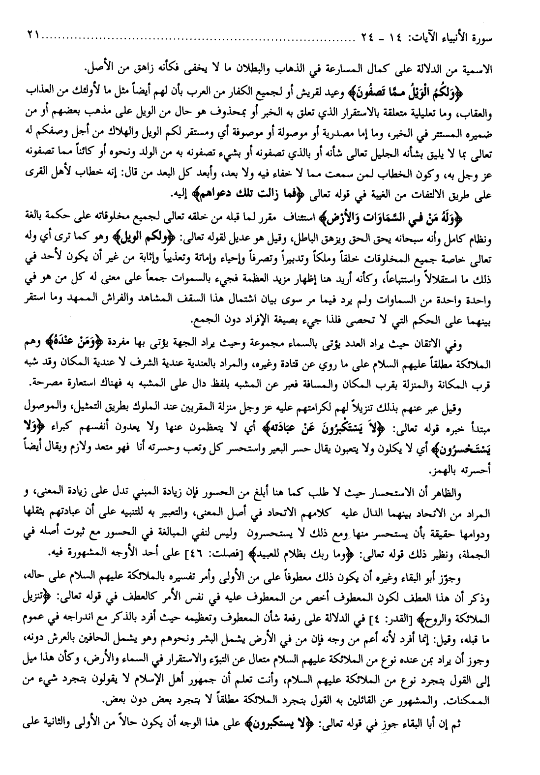وجوّز أبو البقاء وغيره أن يكون ذلك معطوفا على من الأولى وأمر تفسيره بالملائكة عليهم السلام على حاله، وذكر أن هذا العطف لكون المعطوف أخص من المعطوف عليه في نفس الأمر كالعطف في قوله تعالى: تَنَزَّلُ الْمَلائِكَةُ وَالرُّوحُ [القدر: 4] في الدلالة على رفعة شأن المعطوف وتعظيمه حيث أفرد بالذكر مع اندراجه في عموم ما قبله، وقيل: إنما أفرد لأنه أعم من وجه فإن من في الأرض يشمل البشر ونحوهم وهو يشمل الحافين بالعرش دونه، وجوز أن يراد بمن عنده نوع من الملائكة عليهم السلام متعال عن التبوّء والاستقرار في السماء والأرض، وكأن هذا ميل إلى القول بتجرد نوع من الملائكة عليهم السلام، وأنت تعلم أن جمهور أهل الإسلام لا يقولون بتجرد شيء من الممكنات. والمشهور عن القائلين به القول بتجرد الملائكة مطلقا لا بتجرد بعض دون بعض.