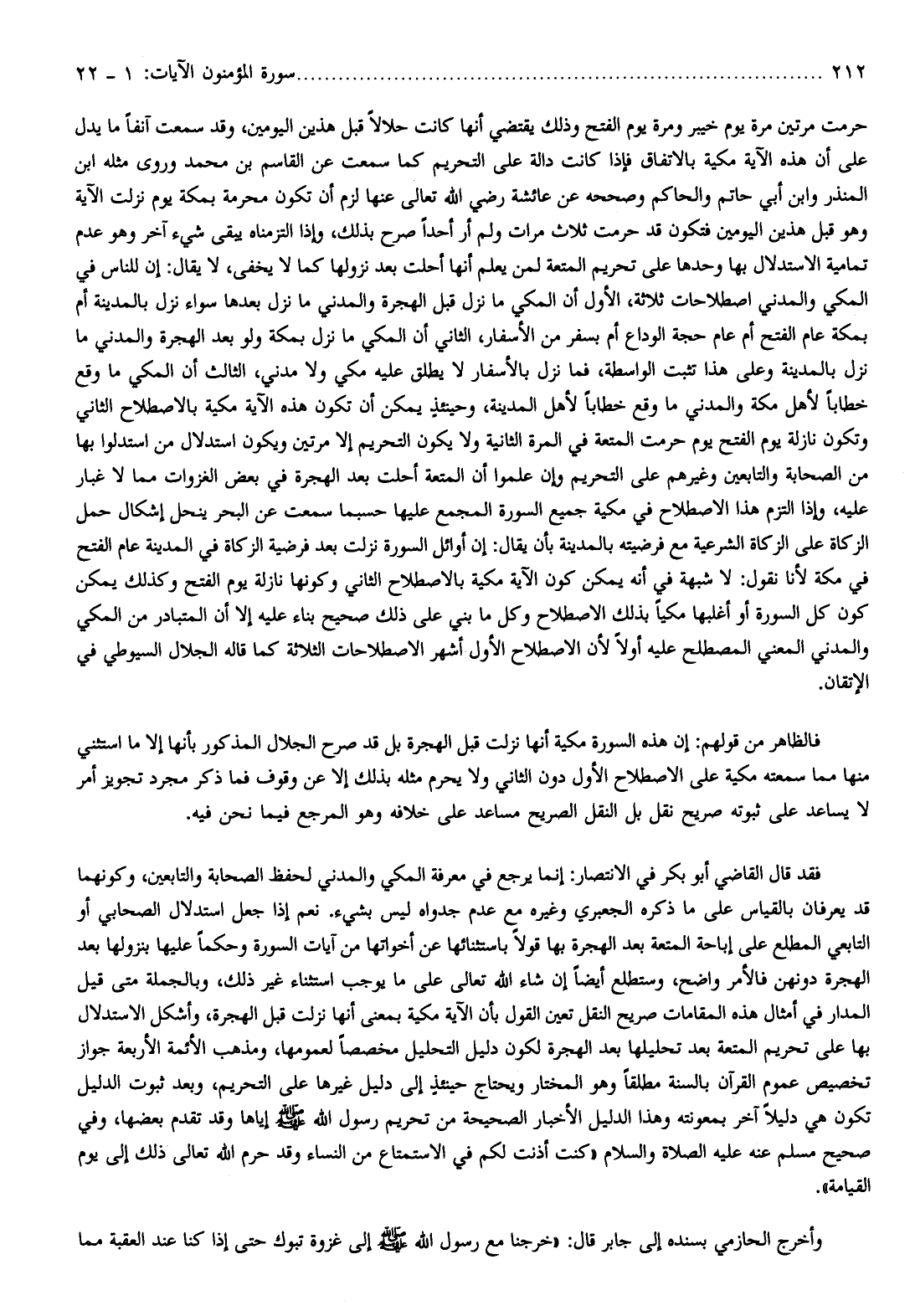 فقد قال القاضي أبو بكر في الانتصار: إنما يرجع في معرفة المكي والمدني لحفظ الصحابة والتابعين، وكونهما قد يعرفان بالقياس على ما ذكره الجعبري وغيره مع عدم جدواه ليس بشيء. نعم إذا جعل استدلال الصحابي أو التابعي المطلع على إباحة المتعة بعد الهجرة بها قولا باستثنائها عن أخواتها من آيات السورة وحكما عليها بنزولها بعد الهجرة دونهن فالأمر واضح، وستطلع أيضا إن شاء الله تعالى على ما يوجب استثناء غير ذلك، وبالجملة متى قيل المدار في أمثال هذه المقامات صريح النقل تعين القول بأن الآية مكية بمعنى أنها نزلت قبل الهجرة، وأشكل الاستدلال بها على تحريم المتعة بعد تحليلها بعد الهجرة لكون دليل التحليل مخصصا لعمومها، ومذهب الأئمة الأربعة جواز تخصيص عموم القرآن بالسنة مطلقا وهو المختار ويحتاج حينئذ إلى دليل غيرها على التحريم، وبعد ثبوت الدليل تكون هي دليلا آخر بمعونته وهذا الدليل الأخبار الصحيحة من تحريم رسول الله صلّى الله عليه وسلّم إياها وقد تقدم بعضها،