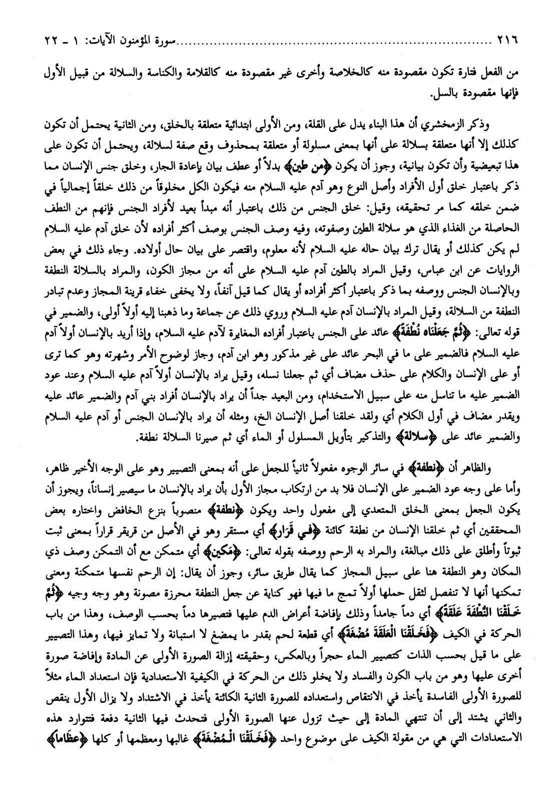 والظاهر أن نُطْفَةً في سائر الوجوه مفعولا ثانيا للجعل على أنه بمعنى التصيير وهو على الوجه الأخير ظاهر، وأما على وجه عود الضمير على الإنسان فلا بد من ارتكاب مجاز الأول بأن يراد بالإنسان ما سيصير إنسانا، ويجوز أن يكون الجعل بمعنى الخلق المتعدي إلى مفعول واحد ويكون نُطْفَةً منصوبا بنزع الخافض واختاره بعض المحققين أي ثم خلقنا الإنسان من نطفة كائنة فِي قَرارٍ أي مستقر وهو في الأصل من قريقر قرارا بمعنى ثبت ثبوتا وأطلق على ذلك مبالغة، والمراد به الرحم ووصفه بقوله تعالى: مَكِينٍ أي متمكن مع أن التمكن وصف ذي المكان وهو النطفة هنا على سبيل المجاز كما يقال طريق سائر، وجوز أن يقال: إن الرحم نفسها متمكنة ومعنى تمكنها أنها لا تنفصل لثقل حملها أولا تمج ما فيها فهو كناية عن جعل النطفة محرزة مصونة وهو وجه وجيه ثُمَّ خَلَقْنَا النُّطْفَةَ عَلَقَةً أي دما جامدا وذلك بإفاضة أعراض الدم عليها فتصيرها دما بحسب الوصف، وهذا من باب الحركة في الكيف فَخَلَقْنَا الْعَلَقَةَ مُضْغَةً أي قطعة لحم بقدر ما يمضغ لا استبانة ولا تمايز فيها، وهذا التصيير على ما قيل بحسب الذات كتصيير الماء حجرا وبالعكس، وحقيقته إزالة الصورة الأولى عن المادة وإفاضة صورة أخرى عليها وهو من باب الكون والفساد ولا يخلو ذلك من الحركة في الكيفية الاستعدادية فإن استعداد الماء مثلا للصورة الأولى الفاسدة يأخذ في الانتقاص واستعداده للصورة الثانية الكائنة يأخذ في الاشتداد ولا يزال الأول ينقص والثاني يشتد إلى أن تنتهي المادة إلى حيث تزول عنها الصورة الأولى فتحدث فيها الثانية دفعة فتتوارد هذه الاستعدادات التي هي من مقولة الكيف على موضوع واحد فَخَلَقْنَا الْمُضْغَةَ غالبها ومعظمها أو كلها عِظاماً