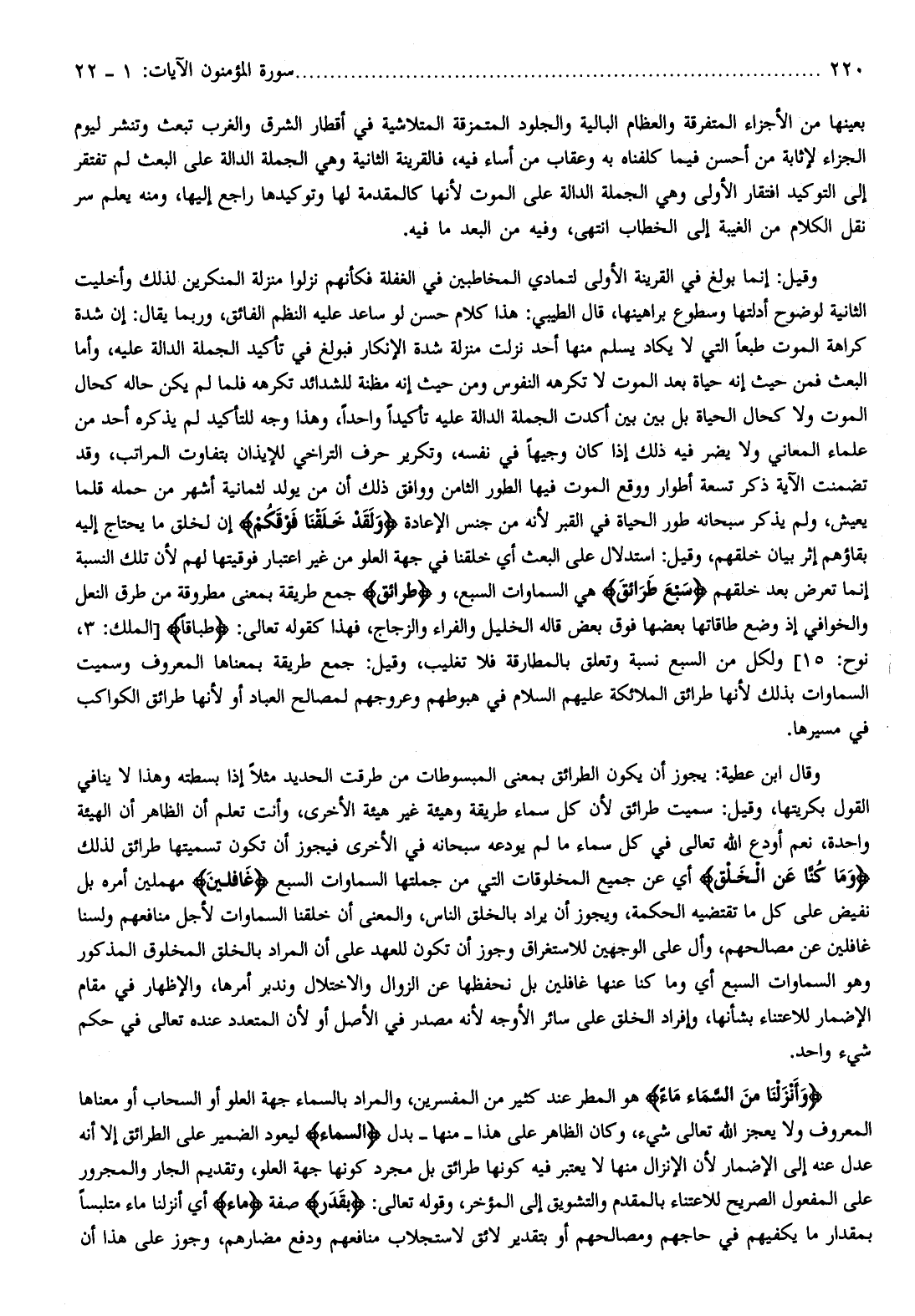 وقيل: إنما بولغ في القرينة الأولى لتمادي المخاطبين في الغفلة فكأنهم نزلوا منزلة المنكرين لذلك وأخليت الثانية لوضوح أدلتها وسطوع براهينها، قال الطيبي: هذا كلام حسن لو ساعد عليه النظم الفائق، وربما يقال: إن شدة كراهة الموت طبعا التي لا يكاد يسلم منها أحد نزلت منزلة شدة الإنكار فبولغ في تأكيد الجملة الدالة عليه، وأما البعث فمن حيث إنه حياة بعد الموت لا تكرهه النفوس ومن حيث إنه مظنة للشدائد تكرهه فلما لم يكن حاله كحال الموت ولا كحال الحياة بل بين بين أكدت الجملة الدالة عليه تأكيدا واحدا، وهذا وجه للتأكيد لم يذكره أحد من علماء المعاني ولا يضر فيه ذلك إذا كان وجيها في نفسه، وتكرير حرف التراخي للإيذان بتفاوت المراتب، وقد تضمنت الآية ذكر تسعة أطوار ووقع الموت فيها الطور الثامن ووافق ذلك أن من يولد لثمانية أشهر من حمله قلما يعيش، ولم يذكر سبحانه طور الحياة في القبر لأنه من جنس الإعادة وَلَقَدْ خَلَقْنا فَوْقَكُمْ إن لخلق ما يحتاج إليه بقاؤهم إثر بيان خلقهم، وقيل: استدلال على البعث أي خلقنا في جهة العلو من غير اعتبار فوقيتها لهم لأن تلك النسبة إنما تعرض بعد خلقهم سَبْعَ طَرائِقَ هي السماوات السبع، وطَرائِقَ جمع طريقة بمعنى مطروقة من طرق النعل والخوافي إذ وضع طاقاتها بعضها فوق بعض قاله الخليل والفراء والزجاج، فهذا كقوله تعالى: طِباقاً [الملك: 3، نوح: 15] ولكل من السبع نسبة وتعلق بالمطارقة فلا تغليب، وقيل: جمع طريقة بمعناها المعروف وسميت السماوات بذلك لأنها طرائق الملائكة عليهم السلام في هبوطهم وعروجهم لمصالح العباد أو لأنها طرائق الكواكب في مسيرها.
