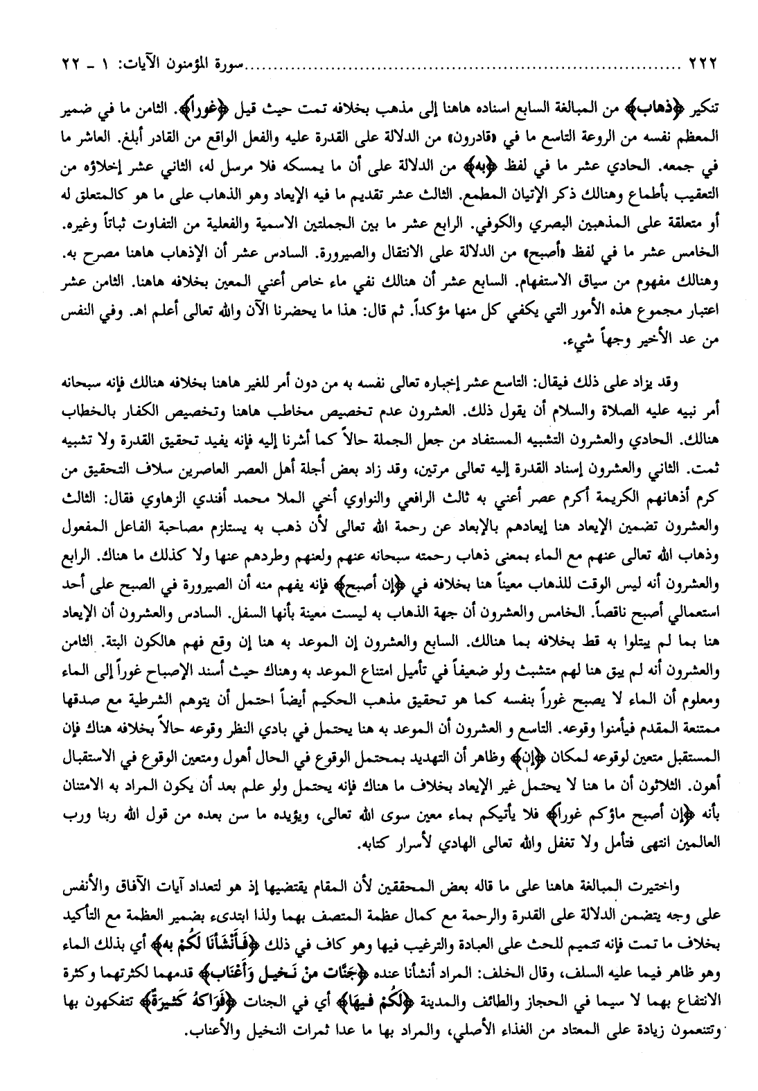 تنكير ذَهابٍ من المبالغة السابع اسناده هاهنا إلى مذهب بخلافه تمت حيث قيل غَوْراً. الثامن ما في ضمير المعظم نفسه من الروعة التاسع ما في «قادرون» من الدلالة على القدرة عليه والفعل الواقع من القادر أبلغ. العاشر ما في جمعه. الحادي عشر ما في لفظ بِهِ من الدلالة على أن ما يمسكه فلا مرسل له، الثاني عشر إخلاؤه من التعقيب بأطماع وهنالك ذكر الإتيان المطمع. الثالث عشر تقديم ما فيه الإيعاد وهو الذهاب على ما هو كالمتعلق له أو متعلقة على المذهبين البصري والكوفي. الرابع عشر ما بين الجملتين الاسمية والفعلية من التفاوت ثباتا وغيره.