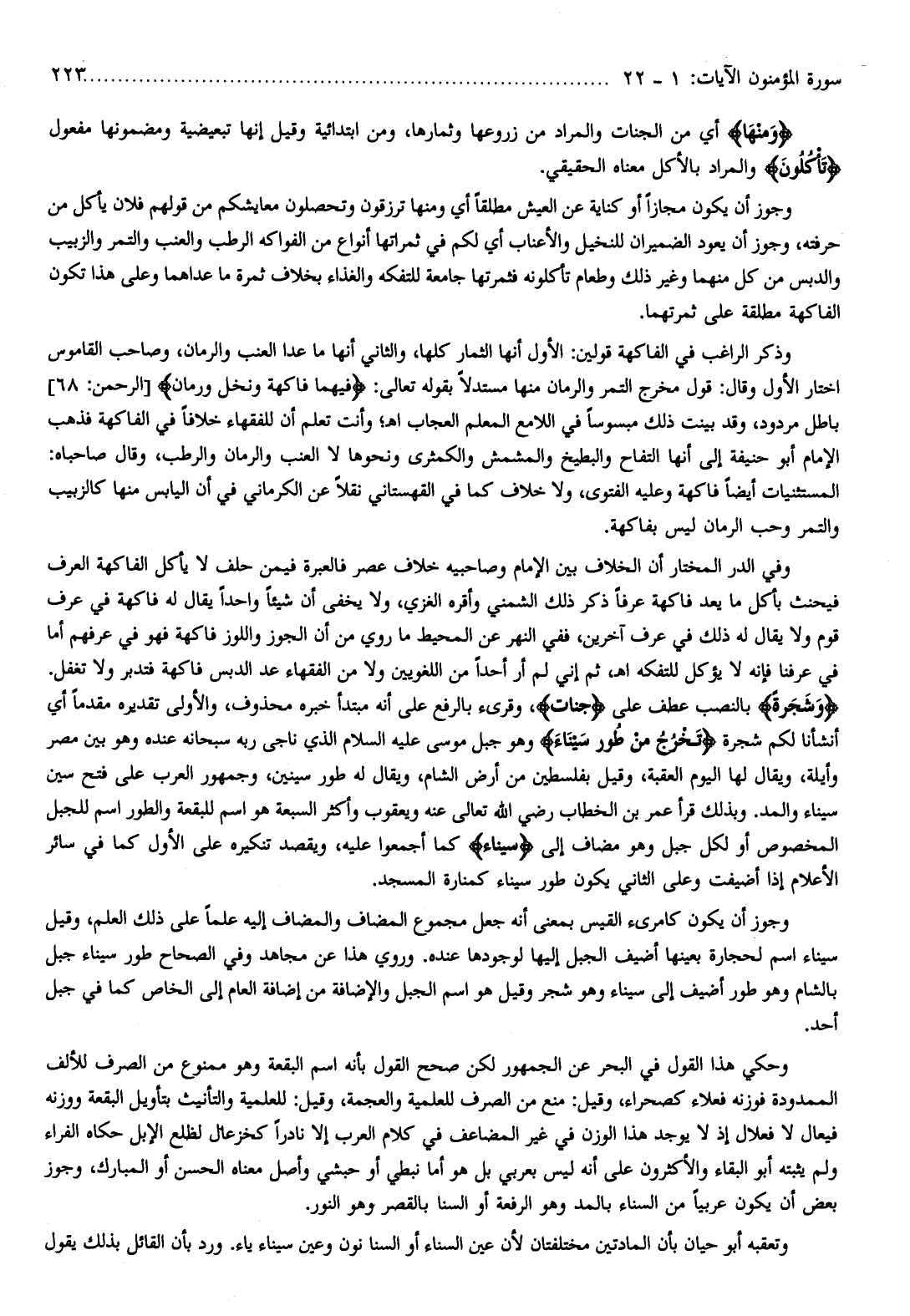 وَشَجَرَةً بالنصب عطف على جَنَّاتٍ، وقرىء بالرفع على أنه مبتدأ خبره محذوف، والأولى تقديره مقدما أي أنشأنا لكم شجرة تَخْرُجُ مِنْ طُورِ سَيْناءَ وهو جبل موسى عليه السلام الذي ناجى ربه سبحانه عنده وهو بين مصر وأيلة، ويقال لها اليوم العقبة، وقيل بفلسطين من أرض الشام، ويقال له طور سينين، وجمهور العرب على فتح سين سيناء والمد. وبذلك قرأ عمر بن الخطاب رضي الله تعالى عنه ويعقوب وأكثر السبعة هو اسم للبقعة والطور اسم للجبل المخصوص أو لكل جبل وهو مضاف إلى سَيْناءَ كما أجمعوا عليه، ويقصد تنكيره على الأول كما في سائر الأعلام إذا أضيفت وعلى الثاني يكون طور سيناء كمنارة المسجد.