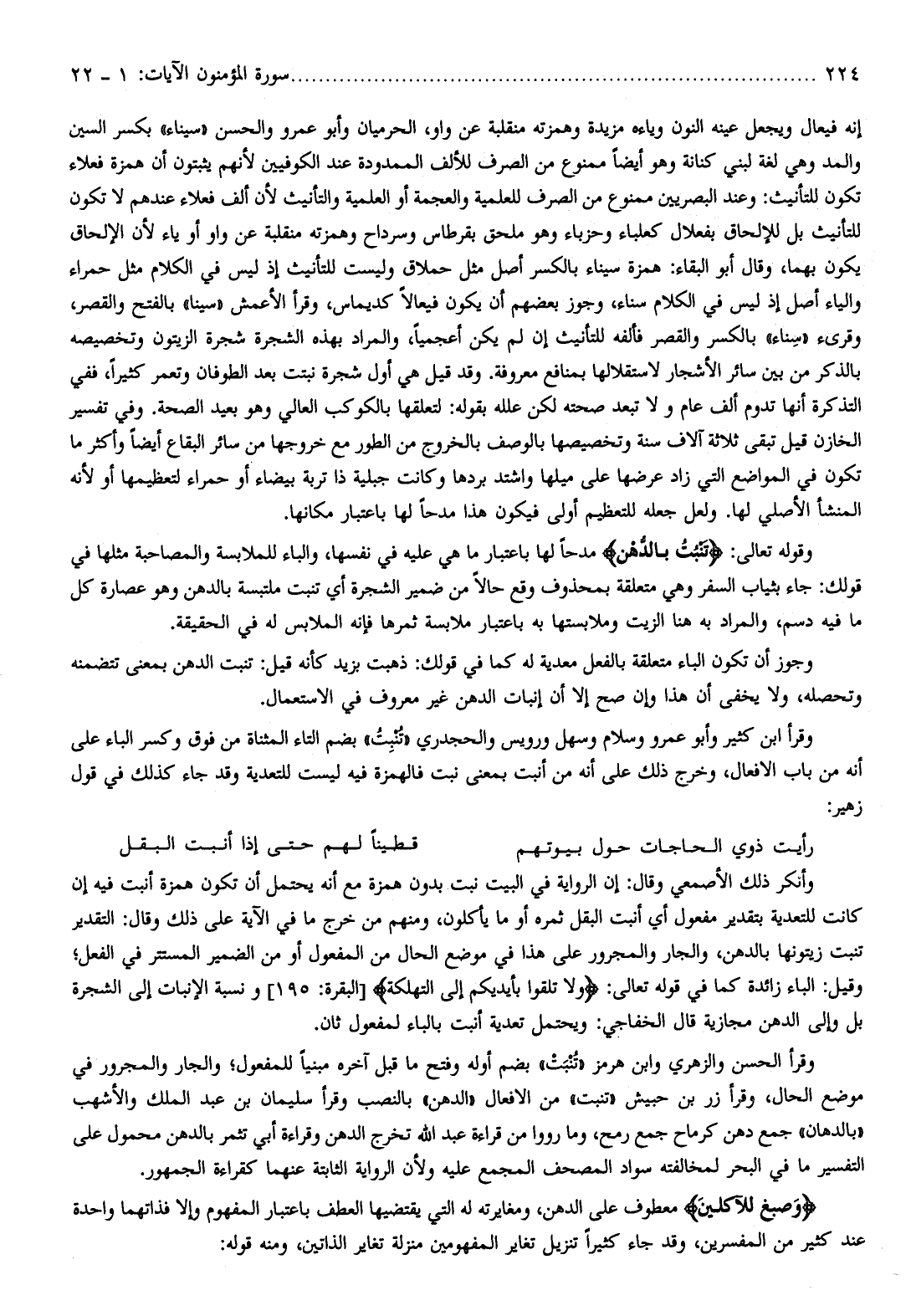 وقرأ الحسن والزهري وابن هرمز «تنبت» بضم أوله وفتح ما قبل آخره مبنيا للمفعول والجار والمجرور في موضع الحال، وقرأ زر بن حبيش «تنبت» من الافعال «الدهن» بالنصب وقرأ سليمان بن عبد الملك والأشهب «بالدهان» جمع دهن كرماح جمع رمح، وما رووا من قراءة عبد الله تخرج الدهن وقراءة أبي تثمر بالدهن محمول على التفسير ما في البحر لمخالفته سواد المصحف المجمع عليه ولأن الرواية الثابتة عنهما كقراءة الجمهور.