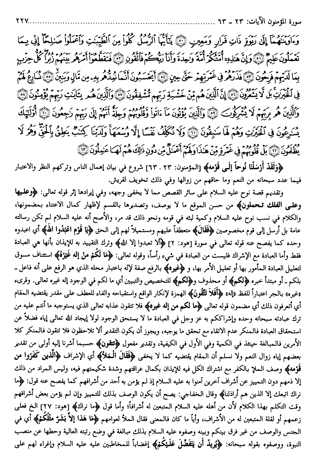 من حسن الموقع ما لا يوصف، وتصديرها بالقسم لإظهار كمال الاعتناء بمضمونها، والكلام في نسب نوح عليه السلام وكمية لبثه في قومه ونحو ذلك قد مر، والأصح أنه عليه السلام لم تكن رسالته عامة بل أرسل إلى قوم مخصوصين فَقالَ متعطفا عليهم ومستميلا لهم إلى الحق يا قَوْمِ اعْبُدُوا اللَّهَ أي اعبدوه وحده كما يفصح عنه قوله تعالى في سورة [هود: 2] أَلَّا تَعْبُدُوا إِلَّا اللَّهَ وترك التقييد به للإيذان بأنها هي العبادة فقط وأما العبادة مع الإشراك فليست من العبادة في شيء رأسا، وقوله تعالى: ما لَكُمْ مِنْ إِلهٍ غَيْرُهُ استئناف مسوق لتعليل العبادة المأمور بها أو تعليل الأمر بها، وغَيْرُهُ بالرفع صفة لإله باعتبار محله الذي هو الرفع على أنه فاعل- بلكم- أو مبتدأ خبره لَكُمْ أو محذوف ولَكُمْ للتخصيص والتبيين أي ما لكم في الوجود إله غيره تعالى. وقرىء «غيره» بالجر اعتبارا للفظ «إله» أَفَلا تَتَّقُونَ الهمزة لإنكار الواقع واستقباحه والفاء للعطف على مقدر يقتضيه المقام أي أتعرفون ذلك أي مضمون قوله تعالى ما لَكُمْ مِنْ إِلهٍ غَيْرُهُ فلا تتقون عذابه تعالى الذي يستوجبه ما أنتم عليه من ترك عبادته سبحانه وحده وإشراككم به عز وجل في العبادة ما لا يستحق الوجود لولا إيجاد الله تعالى إياه فضلا عن استحقاق العبادة فالمنكر عدم الاتقاء مع تحقق ما يوجبه، ويجوز أن يكون التقدير ألا تلاحظون فلا تتقون فالمنكر كلا الأمرين فالمبالغة حينئذ في الكمية وفي الأول في الكيفية، وتقدير مفعول تَتَّقُونَ حسبما أشرنا إليه أولى من تقدير بعضهم إياه زوال النعم ولا نسلم أن المقام يقتضيه كما لا يخفى فَقالَ الْمَلَأُ أي الإشراف الَّذِينَ كَفَرُوا مِنْ قَوْمِهِ وصف الملإ بالكفر مع اشتراك الكل فيه للإيذان بكمال عراقتهم وشدة شكيمتهم فيه، وليس المراد من ذلك إلا ذمهم دون التمييز عن أشراف آخرين آمنوا به عليه السلام إذ لم يؤمن به أحد من أشرافهم كما يفصح عنه قول: ما نَراكَ اتَّبَعَكَ إِلَّا الَّذِينَ هُمْ أَراذِلُنا وقال الخفاجي: يصح أن يكون الوصف بذلك للتمييز وإن لم يؤمن بعض أشرافهم وقت التكلم بهذا الكلام لأن من أهله عليه السلام المتبعين له أشرافا وأما قول ما نَراكَ [هود: 27] إلخ فعلى زعمهم أو لقلة المتبعين له من الأشراف، وأيا ما كان فالمعنى فقال الملأ لعوامهم ما هذا إِلَّا بَشَرٌ مِثْلُكُمْ أي في الجنس والوصف من غير فرق بينكم وبينه وصفوه عليه السلام بذلك مبالغة في وضع رتبته العالية وحطها عن منصب النبوة، ووصفوه بقوله سبحانه: يُرِيدُ أَنْ يَتَفَضَّلَ عَلَيْكُمْ إغضابا للمخاطبين عليه عليه السلام وإغراء لهم على