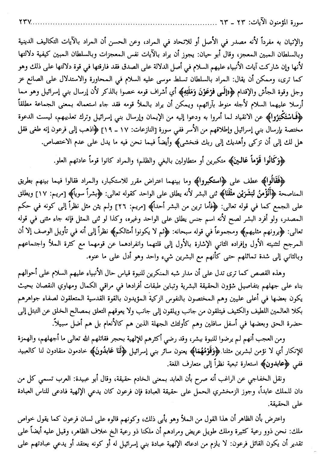 والإتيان به مفردا لأنه مصدر في الأصل أو للاتحاد في المراد، وعن الحسن أن المراد بالآيات التكاليف الدينية وبالسلطان المبين المعجز، وقال أبو حيان: يجوز أن يراد بالآيات نفس المعجزات وبالسلطان المبين كيفية دلالتها لأنها وإن شاركت آيات الأنبياء عليهم السلام في أصل الدلالة على الصدق فقد فارقتها في قوة دلالتها على ذلك وهو كما ترى، وممكن أن يقال: المراد بالسلطان تسلط موسى عليه السلام في المحاورة والاستدلال على الصانع عز وجل وقوة الجأش والإقدام «إِلى فِرْعَوْنَ وَمَلَائِهِ أي أشراف قومه خصوا بالذكر لأن إرسال بني إسرائيل وهو مما أرسلا عليهما السلام لأجله منوط بآرائهم، ويمكن أن يراد بالملأ قومه فقد جاء استعماله بمعنى الجماعة مطلقا فَاسْتَكْبَرُوا عن الانقياد لما أمروا به ودعوا إليه من الإيمان وإرسال بني إسرائيل وترك تعذيبهم، ليست الدعوة مختصة بإرسال بني إسرائيل وإطلاقهم من الأسر ففي سورة [النازعات: 17- 19] اذْهَبْ إِلى فِرْعَوْنَ إِنَّهُ طَغى فَقُلْ هَلْ لَكَ إِلى أَنْ تَزَكَّى وَأَهْدِيَكَ إِلى رَبِّكَ فَتَخْشى وأيضا فيما نحن فيه ما يدل على عدم الاختصاص.