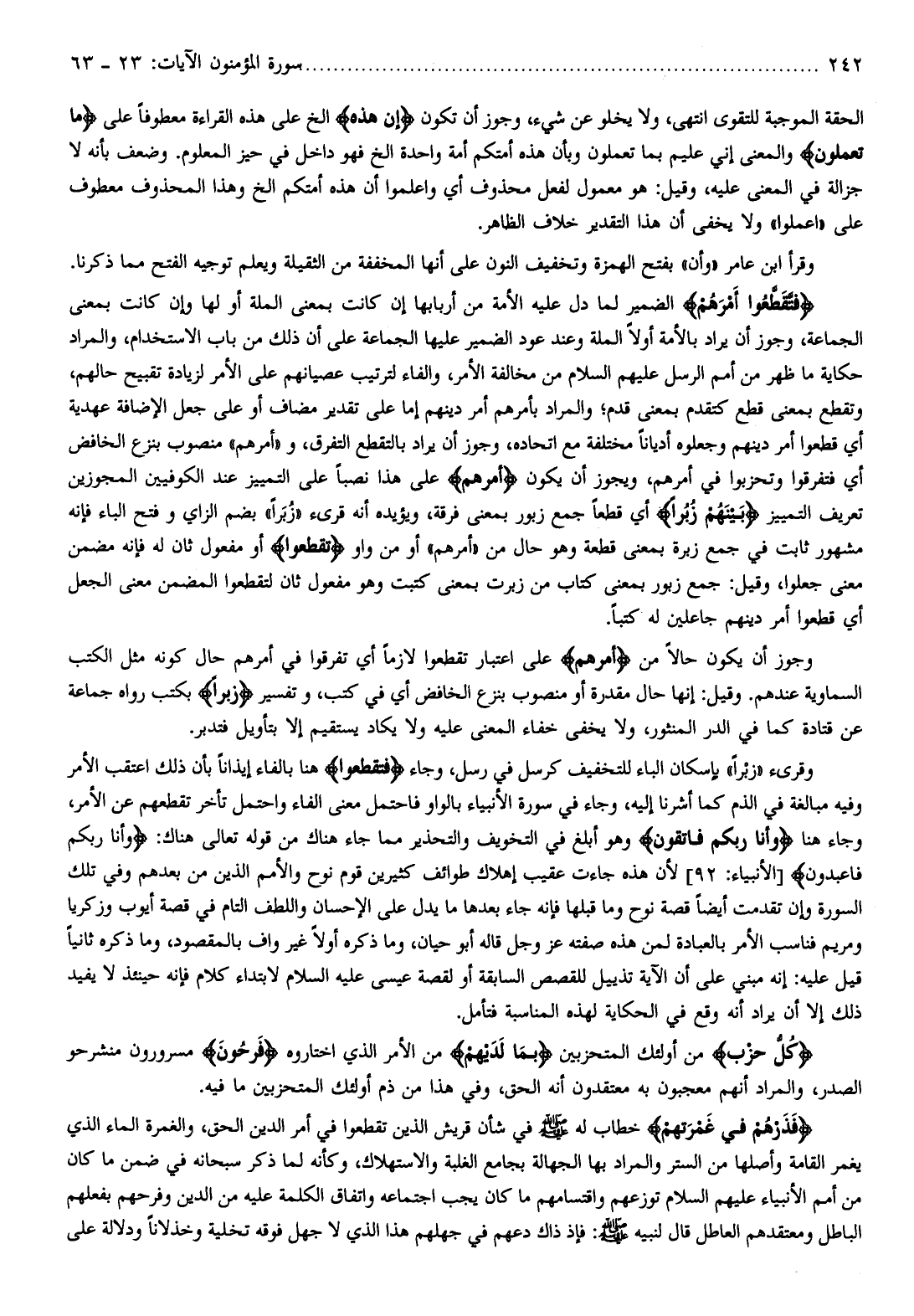 فَتَقَطَّعُوا أَمْرَهُمْ الضمير لما دل عليه الأمة من أربابها إن كانت بمعنى الملة أو لها وإن كانت بمعنى الجماعة، وجوز أن يراد بالأمة أولا الملة وعند عود الضمير عليها الجماعة على أن ذلك من باب الاستخدام، والمراد حكاية ما ظهر من أمم الرسل عليهم السلام من مخالفة الأمر، والفاء لترتيب عصيانهم على الأمر لزيادة تقبيح حالهم، وتقطع بمعنى قطع كتقدم بمعنى قدم والمراد بأمرهم أمر دينهم إما على تقدير مضاف أو على جعل الإضافة عهدية أي قطعوا أمر دينهم وجعلوه أديانا مختلفة مع اتحاده، وجوز أن يراد بالتقطع التفرق، و «أمرهم» منصوب بنزع الخافض أي فتفرقوا وتحزبوا في أمرهم، ويجوز أن يكون أَمْرَهُمْ على هذا نصبا على التمييز عند الكوفيين المجوزين تعريف التمييز بَيْنَهُمْ زُبُراً أي قطعا جمع زبور بمعنى فرقة، ويؤيده أنه قرىء «زبرا» بضم الزاي وفتح الباء فإنه مشهور ثابت في جمع زبرة بمعنى قطعة وهو حال من «أمرهم» أو من واو (تقطعوا) أو مفعول ثان له فإنه مضمن معنى جعلوا، وقيل: جمع زبور بمعنى كتاب من زبرت بمعنى كتبت وهو مفعول ثان لتقطعوا المضمن معنى الجعل أي قطعوا أمر دينهم جاعلين له كتبا.