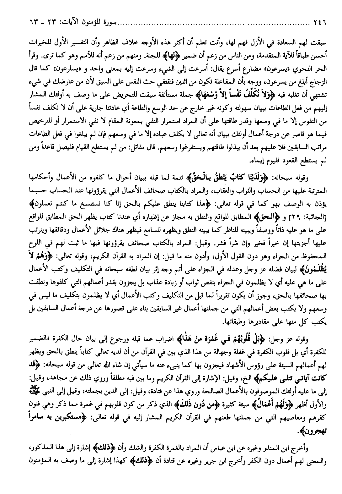 وقوله سبحانه: وَلَدَيْنا كِتابٌ يَنْطِقُ بِالْحَقِّ تتمة لما قبله ببيان أحوال ما كلفوه من الأعمال وأحكامها المترتبة عليها من الحساب والثواب والعقاب، والمراد بالكتاب صحائف الأعمال التي يقرؤونها عند الحساب حسبما يؤذن به الوصف بهو كما في قوله تعالى: هذا كِتابُنا يَنْطِقُ عَلَيْكُمْ بِالْحَقِّ إِنَّا كُنَّا نَسْتَنْسِخُ ما كُنْتُمْ تَعْمَلُونَ [الجاثية: 29] و (الحق) المطابق للواقع والنطق به مجاز عن إظهاره أي عندنا كتاب يظهر الحق المطابق للواقع على ما هو عليه ذاتا ووصفا ويبينه للناظر كما يبينه النطق ويظهره للسامع فيظهر هناك جلائل الأعمال ودقائقها ويترتب عليها أجزيتها إن خيرا فخير وإن شرا فشر. وقيل: المراد بالكتاب صحائف يقرؤونها فيها ما ثبت لهم في اللوح المحفوظ من الجزاء وهو دون القول الأول، وأدون منه ما قيل: إن المراد به القرآن الكريم، وقوله تعالى: وَهُمْ لا يُظْلَمُونَ لبيان فضله عز وجل وعدله في الجزاء على أتم وجه إثر بيان لطفه سبحانه في التكليف وكتب الأعمال على ما هي عليه أي لا يظلمون في الجزاء بنقص ثواب أو زيادة عذاب بل يجزون بقدر أعمالهم التي كلفوها ونطقت بها صحائفها بالحق، وجوز أن يكون تقريرا لما قبل من التكليف وكتب الأعمال أي لا يظلمون بتكليف ما ليس في وسعهم ولا بكتب بعض أعمالهم التي من جملتها أعمال غير السابقين بناء على قصورها عن درجة أعمال السابقين بل يكتب كل منها على مقاديرها وطبقاتها.